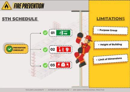 In this project, my group explored the active fire safety requirements outlined in Malaysia's *Uniform Building By-Laws* (UBBL) through site observations at Taylor's University. We examined fire alarm systems, suppression measures, emergency exits, evacuation routes, and fire-resistant materials, comparing them to UBBL standards to analyze how regulations impact interior design.