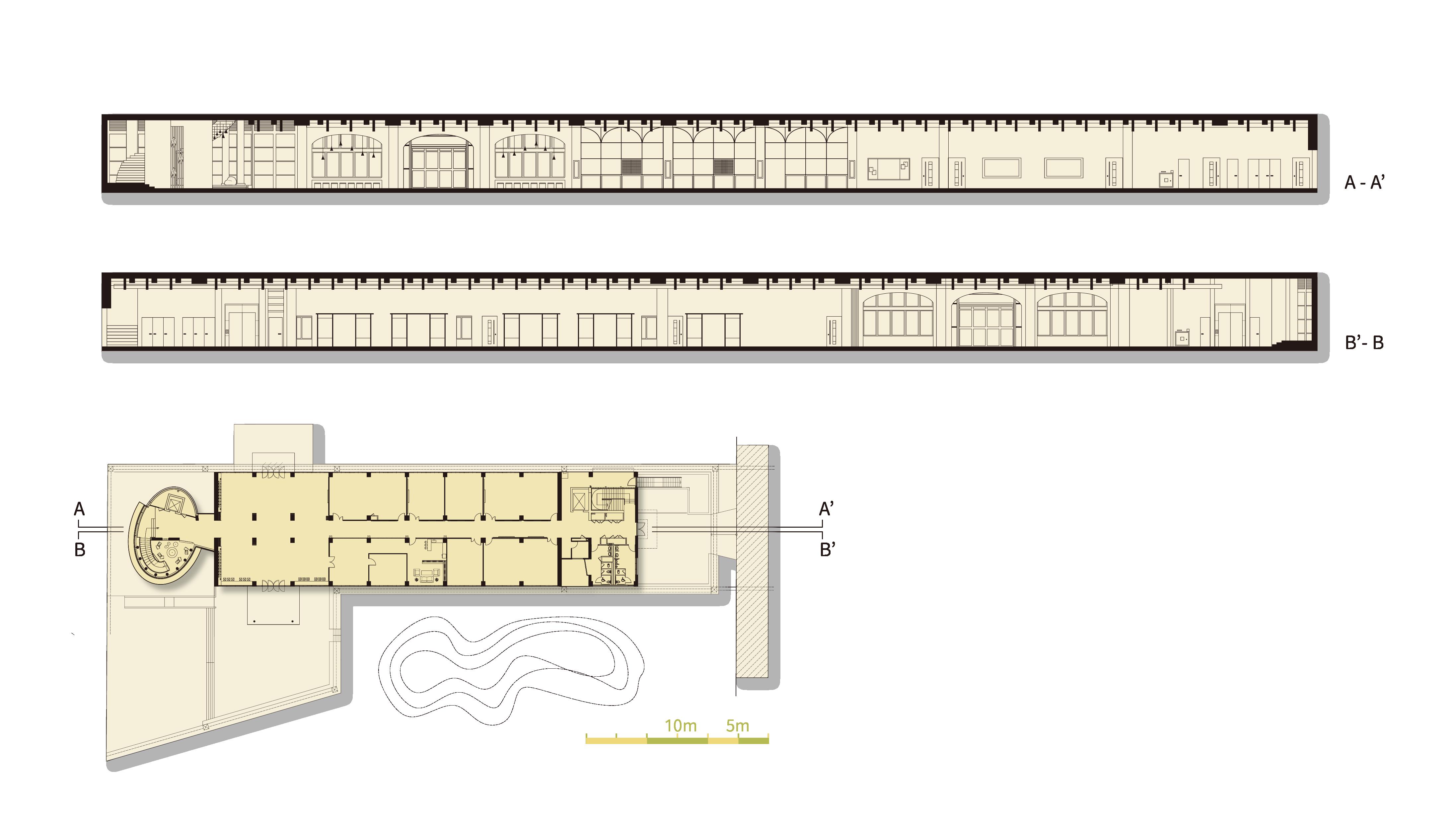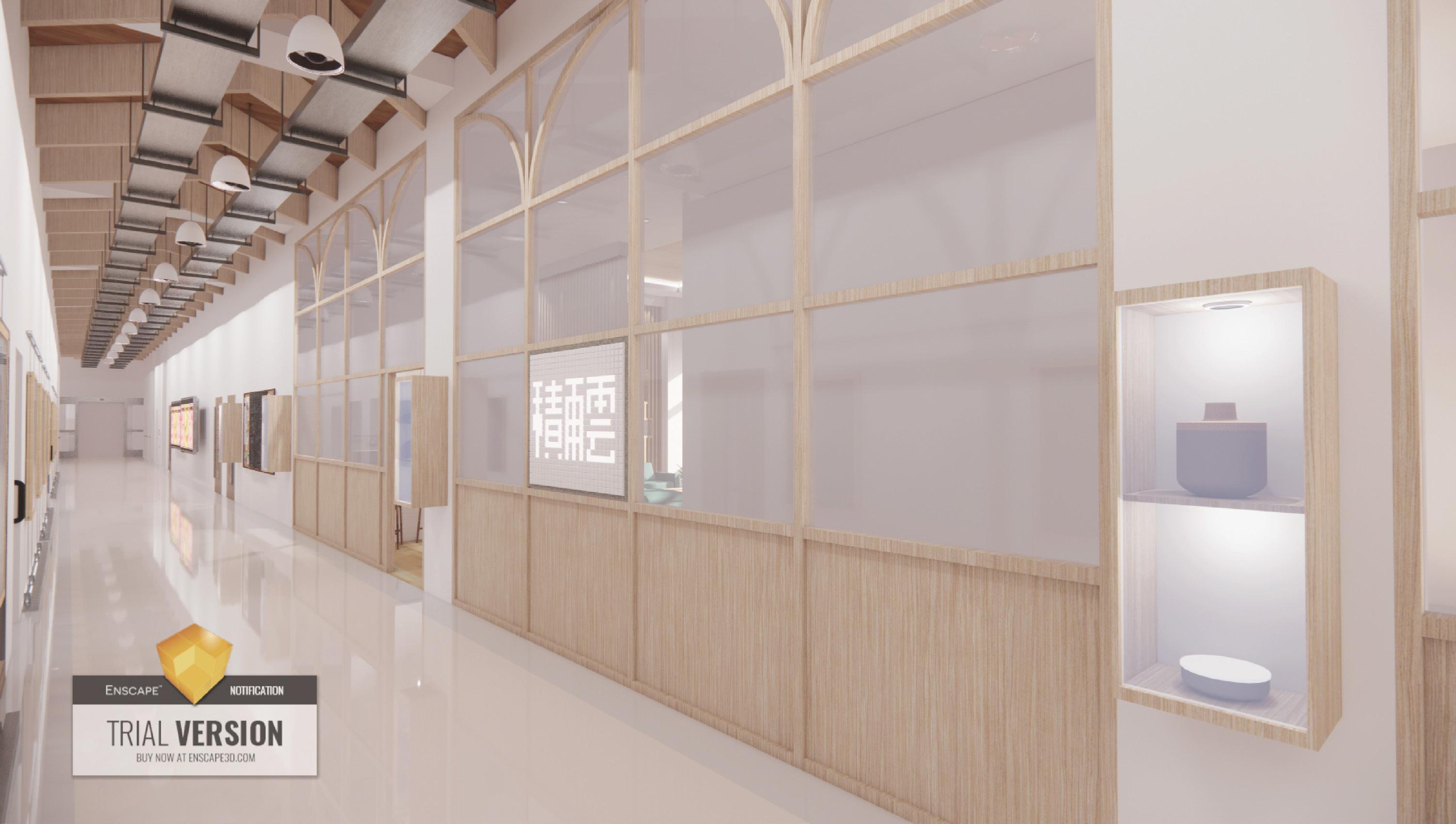 2.右圖-展版重新規劃成簡潔的懸掛展示,改變燈光配置,聚焦作品,而另一側增添展 櫃,展示立體作品,原本的石頭牆面更動成玻璃拉門,降低壓迫感。