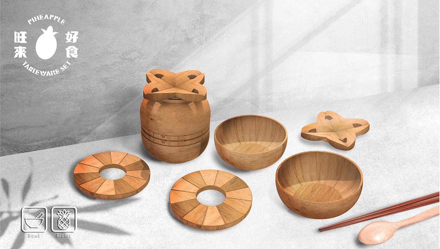 鳳梨是台灣具有代表性的水果,在閩南語中,鳳梨唸作「旺來」,有 好運亨通之意。「旺來好食」是一套木製餐具組,將餐具組合起來, 便是一個完整的鳳梨,將好運帶上餐桌,讓每日和家人一起的溫馨 食光,增添風味。