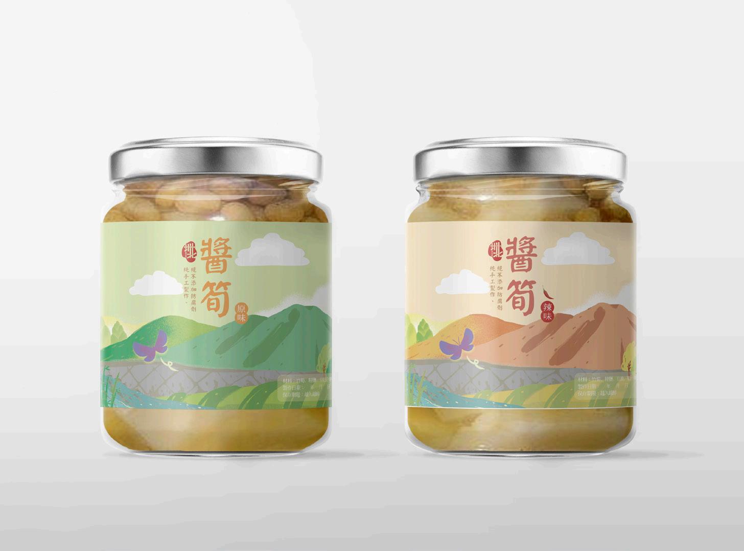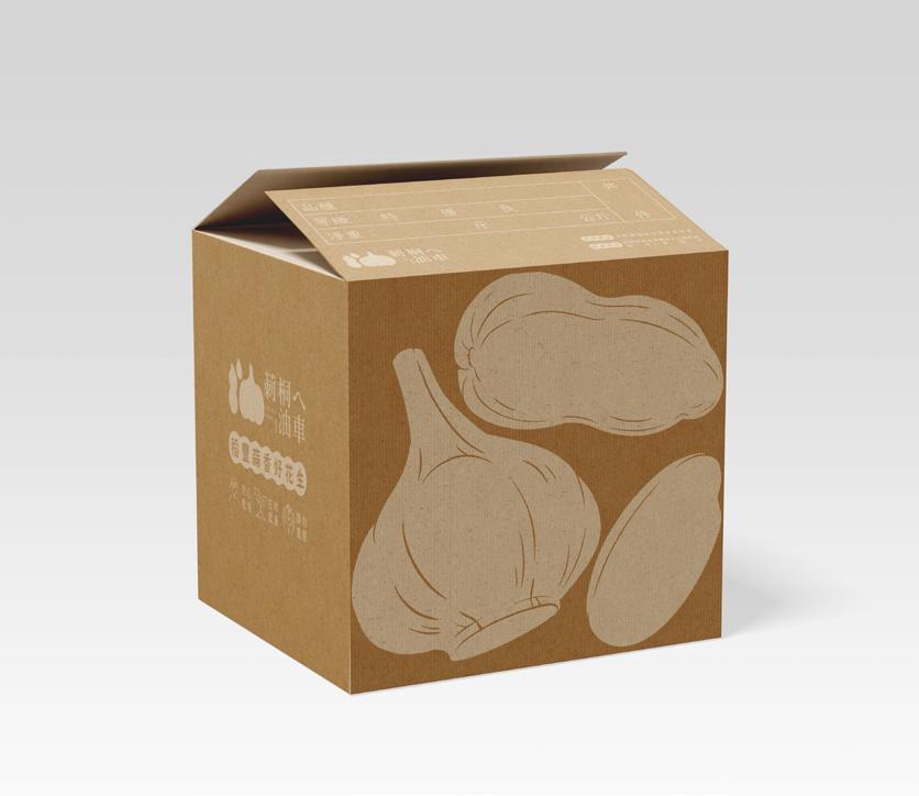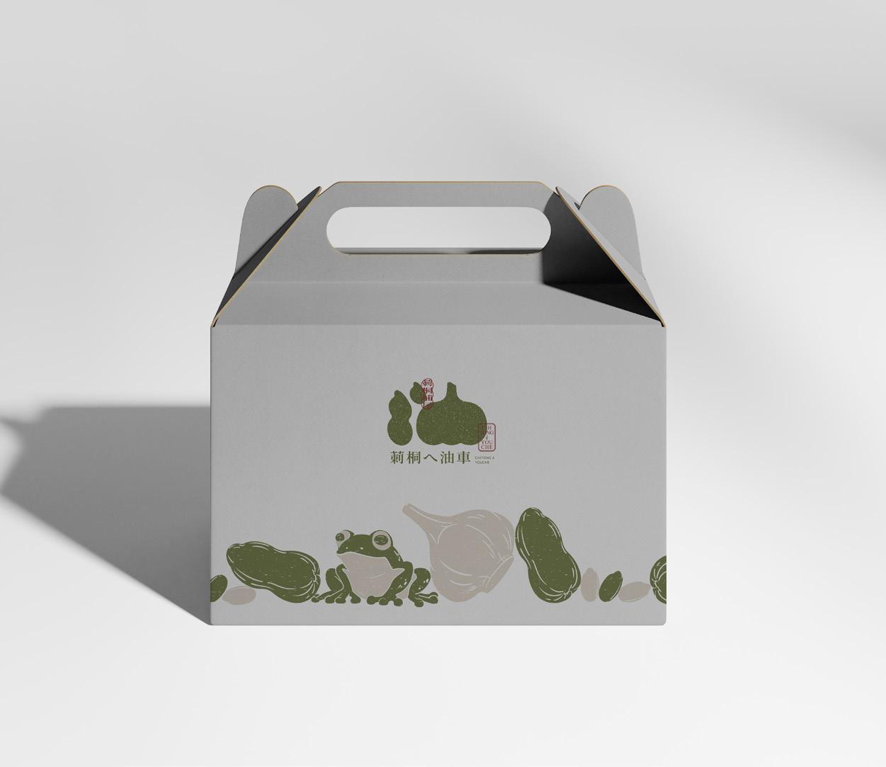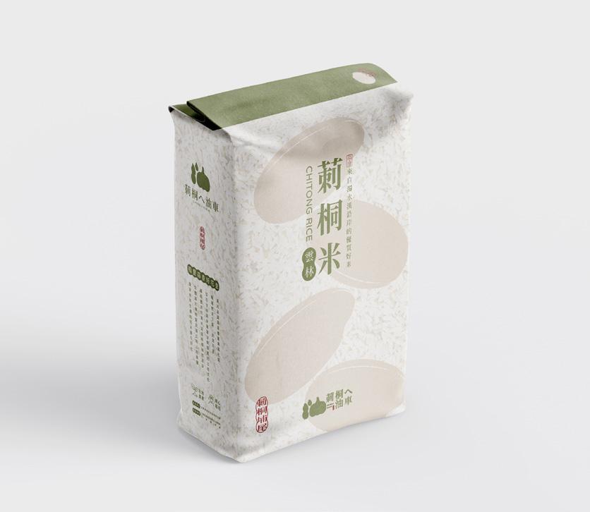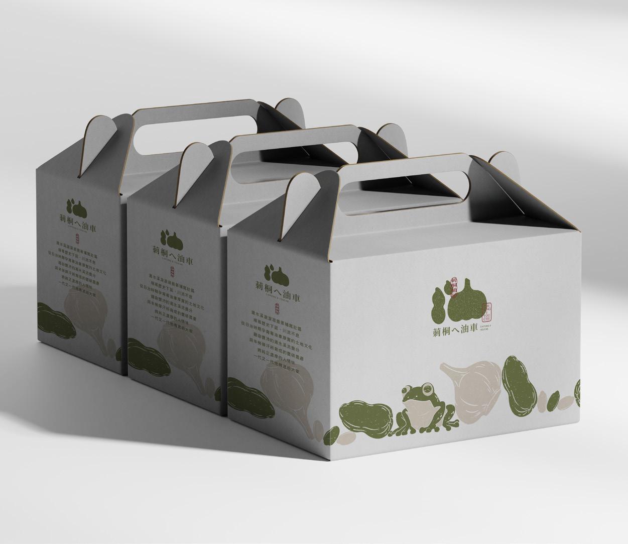 時也是諸羅樹蛙的棲地。品牌LOGO結合埔尾三特色農產,簡潔呈現出「油」字意 象,品牌手提禮盒則以農產加上樹蛙作為輔助圖案,整體低飽和的灰色和綠色營