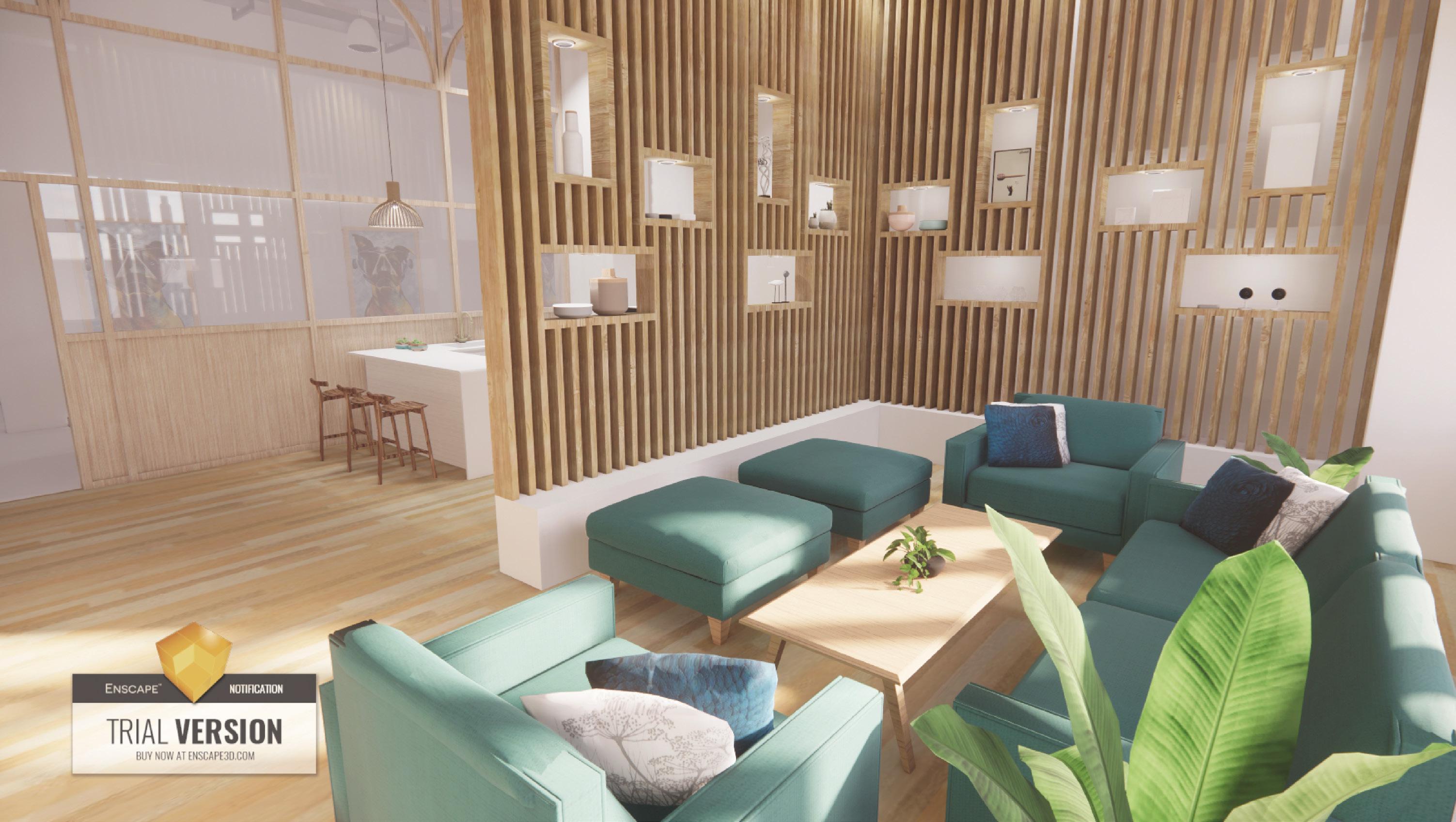 此處有充足採光,又是大家的必經之處,團隊因此將此處改造成一個可供人放鬆心靈的 療癒空間。鋪設木頭地板,讓人可以席地而坐;牆面同樣以輕格柵隔開電梯前的空間, 同時增加隱蔽性;改變空間原本的灰色色調,營造舒適的氛圍。我們是著在空間中製造 互動與對話的可能,且不僅限於人與人之間的交流,更多的是自我和空間的深層對話。