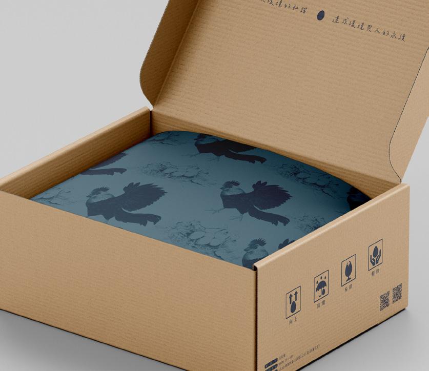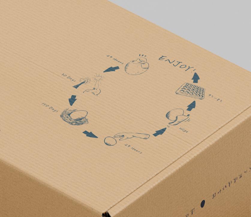自由,同時也讓鹽化的土地休養生息。包裝設計展現可以自由展翅的雞,以及產 在土地上的雞蛋,點出青生活農場自由放牧的特色,另外也以插圖示意雞蛋送到