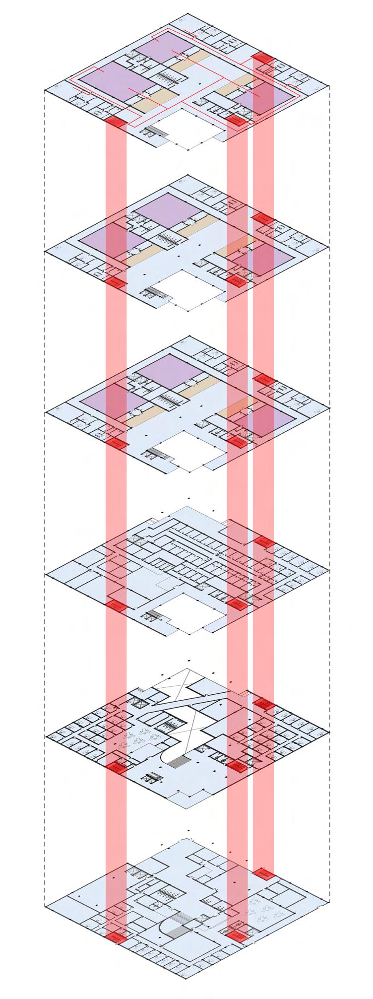 Fresh Air Duct Hot Air Duct 6th Floor 33,457 SQFT Business Area: 25,107 SQFT 100 net 252 ppl Public Waiting Area: 2,140 SQFT 15 net 143 ppl Courtrooms Area: 6,210 SQFT 40 net 156 ppl Occupants: 551 ppl 5th Floor 33,457 SQFT Business Area: 25,527 SQFT 100 net 256 ppl Public Waiting Area: 1,860 SQFT 15 net 124 ppl Courtrooms Area: 6,070 SQFT 40 net 152 ppl Occupants: 532 ppl 4th Floor 33,907 SQFT Business Area: 25,977 SQFT 100 net 260 ppl Public Waiting Area: 1,860 SQFT 15 net 124 ppl Courtrooms Area: 6,070 SQFT 40 net 152 ppl Occupants: 536 ppl 3rd Floor Business Area: 32,747 SQFT 100 net 328 ppl Occupants: 328 ppl 2nd Floor Business Area: 31,112 SQFT 100 net 312 ppl Occupants: 312 ppl 1st Floor Business Area: 35,640 SQFT 100 net 357 ppl Occupants: 357 ppl 3 Vertical Egress Staircase Egress Width 15ft Total Egress Check Diagram Mechanical Axonometric Structure Axonometric