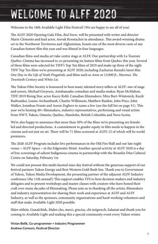 WELCOME TO ALFF 2020 Welcome to the 18th Available Light Film Festival! (We are happy to see all of you) The ALFF 2020 Opening Gala Film, Red Snow, will be presented with writer and director Marie Clements and lead actor, Asivak Koostachin in attendance. This award-winning drama set in the Northwest Territories and Afghanistan, boasts one of the most diverse casts of any Canadian feature film this year and was filmed in four languages. Canadian films and media art take centre stage at ALFF. Our partnership with La Tournée Québec Cinéma has increased to co-presenting six feature films from Quebec this year. Several of these films were selected for TIFF’s Top Ten films of 2019 and make up three of the eight TIFF Top Ten films we’re presenting at ALFF 2020; including Zacharias Kunuk’s latest film One Day in the Life of Noah Piugattuk, and films such as Anne at 13,000 ft., Murmur, The Twentieth Century and White Lie. The Yukon Film Society is honoured to host many talented story-tellers at ALFF: star of stage and screen, Michael Greyeyes, Anishanaabe comedian and media-maker, Ryan McMahon, TIFF 2019 Rising Star, actor Kacey Rohl, Canadian filmmakers: Mira Burt-Wintonick, Kazik Radwanksi, Louise Archambault, Charles Wilkinson, Matthew Rankin, John Price, John Walker, Jonathan Frantz and Aaron Zeghers to name a few (see the full list on page 51). This year we’re hosting 40+ filmmakers, industry representatives, performing and visual artists from NWT, Yukon, Ontario, Quebec, Manitoba, British Columbia and Nova Scotia. We’re also happy to announce that more than 50% of the films we’re presenting are femaleled and directed productions. A commitment to gender equity in film needs to happen in the cinema and not just on set. There will be 71 films screened at ALFF, 12 of which will be world premieres. The 2020 ALFF Program includes live performances in the Old Fire Hall and our late night venue – ALFF Space – in the Edgewater Hotel. Another special activity at ALFF 2020 is a day of free screenings of salient Indigenous cinema in partnership with the Kwanlin Dün Cultural Centre on Saturday, February 1st. We could not present this multi-faceted nine-day festival without the generous support of our festival partners Yukon Energy and Best Western Gold Rush Inn. Thank you to Government of Yukon, Yukon Media Development, the presenting partner of the adjacent ALFF Industry conference (the 11th annual!) This support enables YFS to host decision-makers and industry delegates and to present workshops and master classes with creators who have honed their craft over many decades of filmmaking. Please join us in thanking all the artists, filmmakers and industry representatives for sharing their work and experience at ALFF and ALFF Industry, as well as the sponsors, community organizations and hard-working volunteers and staff that make Available Light 2020 possible. Shäw níthän, Gunalchîsh, Mahsi cho, merci, gracias, chi miigwech, Salamat and thank you for coming to Available Light and making this a special community event every Yukon winter. Vivian Belik, Co-programmer + Industry Programmer Andrew Connors, Festival Director 7