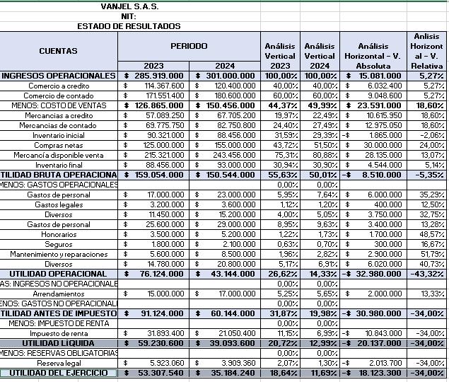 Al revisar el Estado de Resultados correspondiente a los años 2023 y 2024, se evidencia que los ingresos operacionales pasaron de $547.070.000 en 2023 a $601.777.000 en 2024, lo que equivale a un incremento absoluto de $54.707.000 y una variación relativa del 10%, señalando un crecimiento moderado en las ventas.
