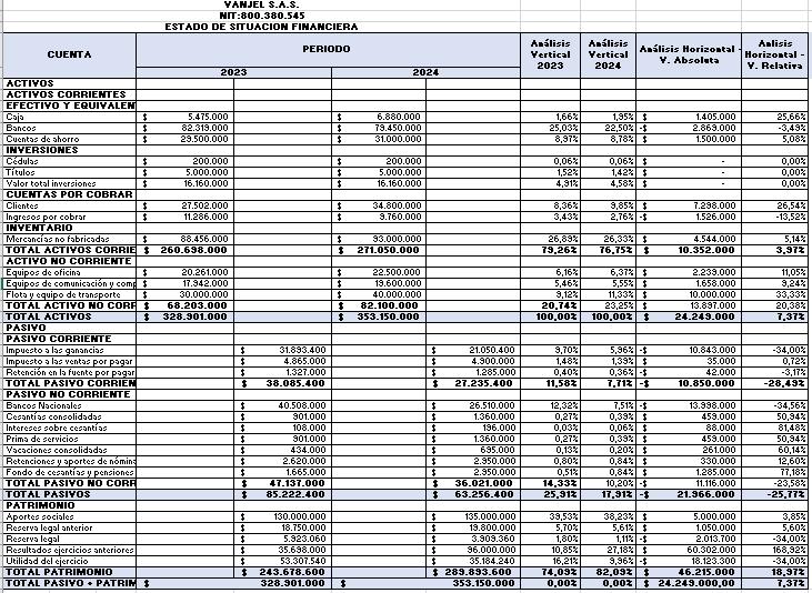 El Estado de Situación Financiera de VANJEL S.A.S. refleja que el total de activos pasó de $366.030.658,40 en 2023 a $405.240.952,00 en 2024, lo que representa un aumento absoluto de $39.210.293,60 y una variación porcentual del 10,71%. Este comportamiento evidencia un crecimiento moderado en los recursos económicos administrados por la empresa.