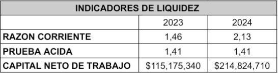 En términos de liquidez, la empresa presentó una mejora importante. La razón corriente aumentó de 1,46 en 2023 a 2,13 en 2024, lo que indica una mayor capacidad para cubrir las obligaciones a corto plazo. Sin embargo, este incremento también puede sugerir que existen activos corrientes que no están siendo utilizados de manera eficiente. La prueba ácida se mantuvo prácticamente igual, pasando de 1,41 a 1,41, reflejando que la compañía está en capacidad de cumplir sus compromisos inmediatos sin depender de la venta de inventarios. Asimismo, el capital de trabajo creció de $115.175.340 a $214.824.710, lo que fortalece su estabilidad operativa diaria.