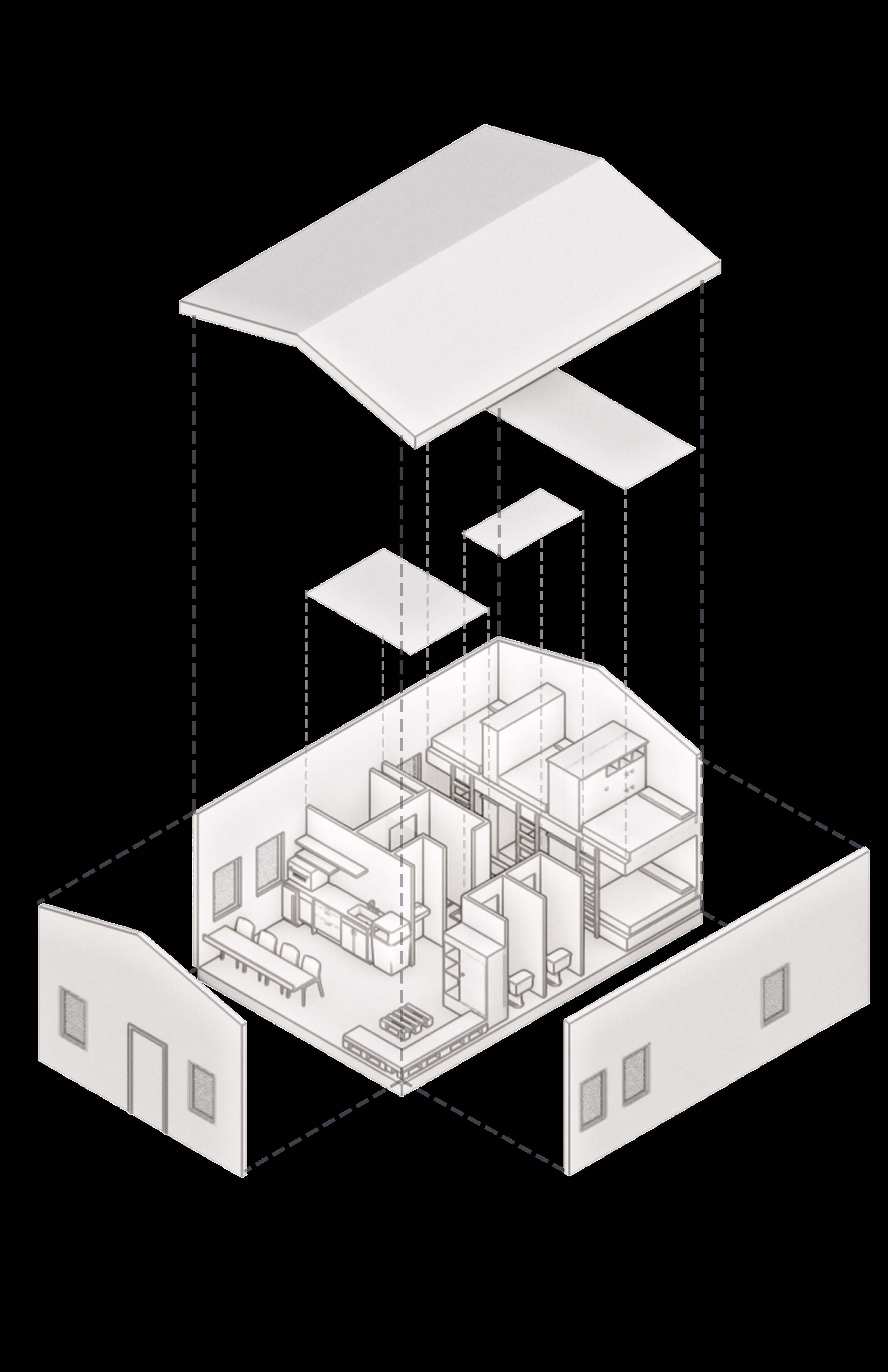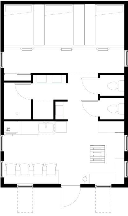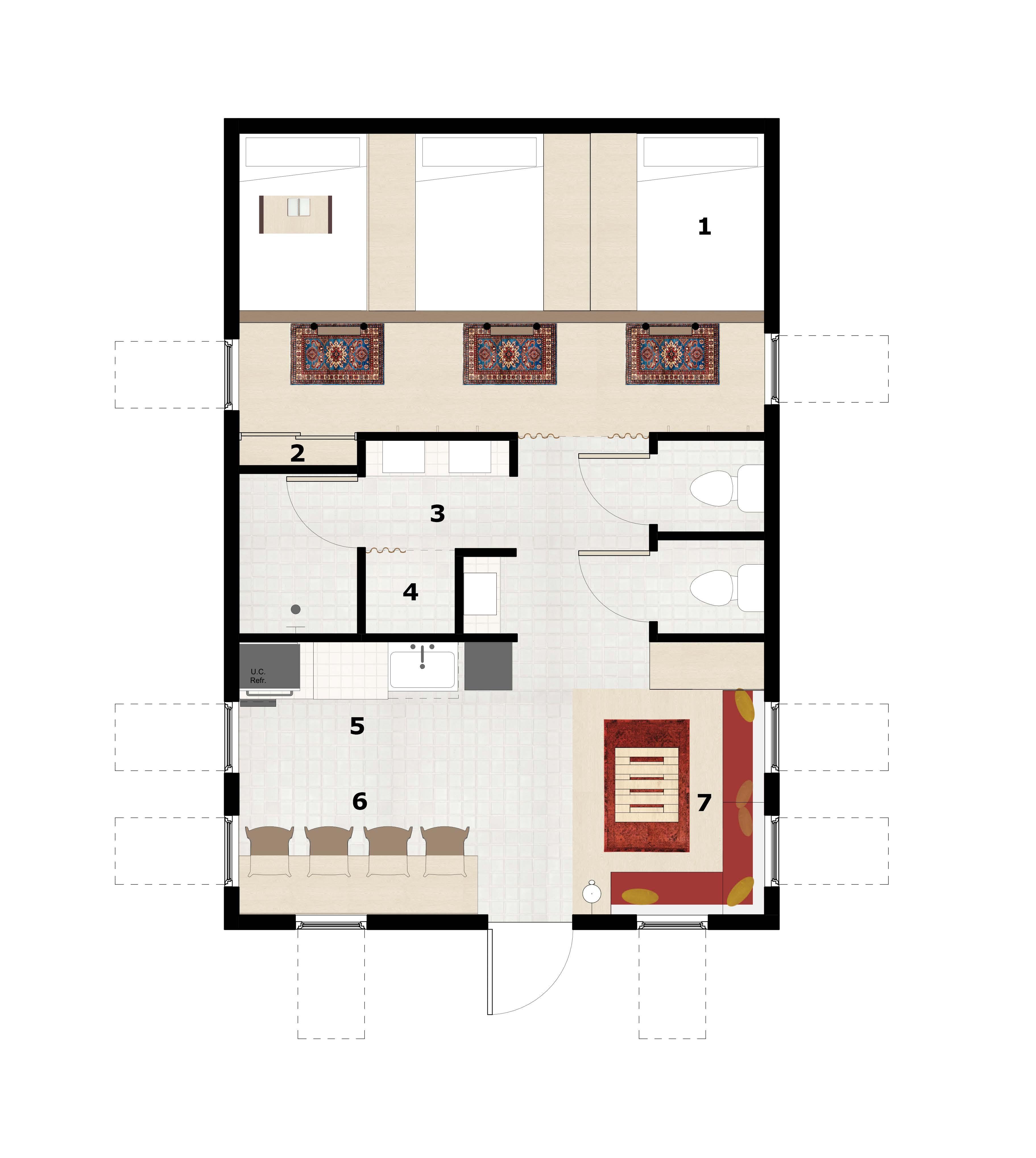 Bedroom Storage Bathroom Changing Room 1. 2. 3. 4. 5. Kitchen 6. Dining Area 7. Living Space FLOORPLAN FURNITURE + MATERIALS (NTS) FLOOR PLAN NTS 1. Bedroom 2. Storage 3. Bathroom 4. Changing Room 5. Kitchen 6. Dining Area 7. Living Space