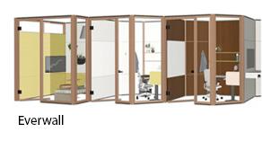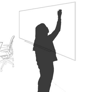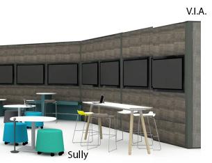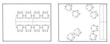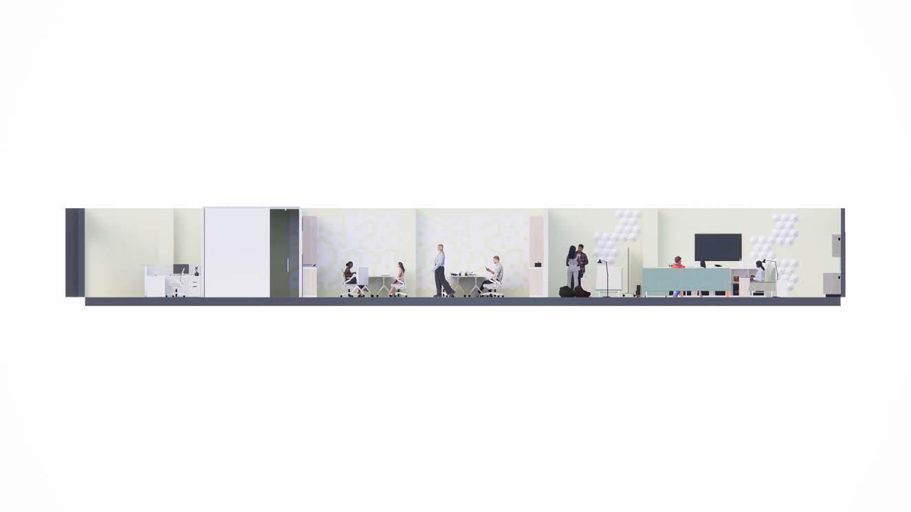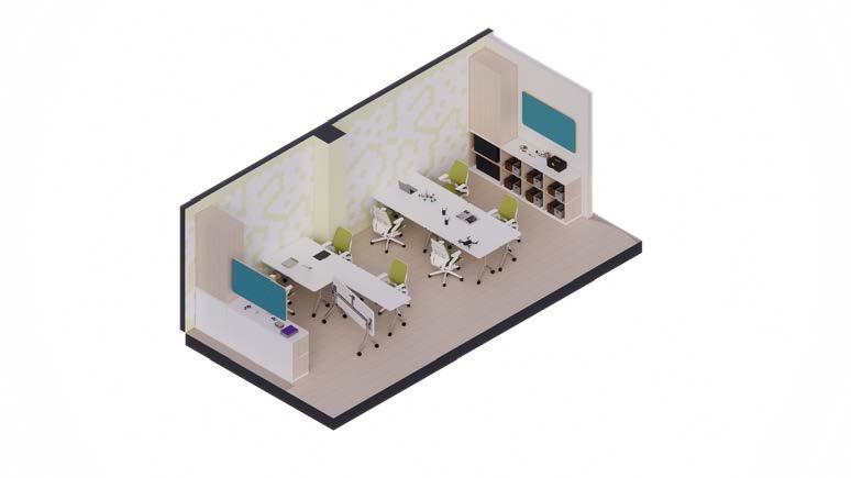 Wall system with screens and seatings for instructions / presentations / brainstorming ideas. Private work desks provided in the back spacetion for a private work mode.