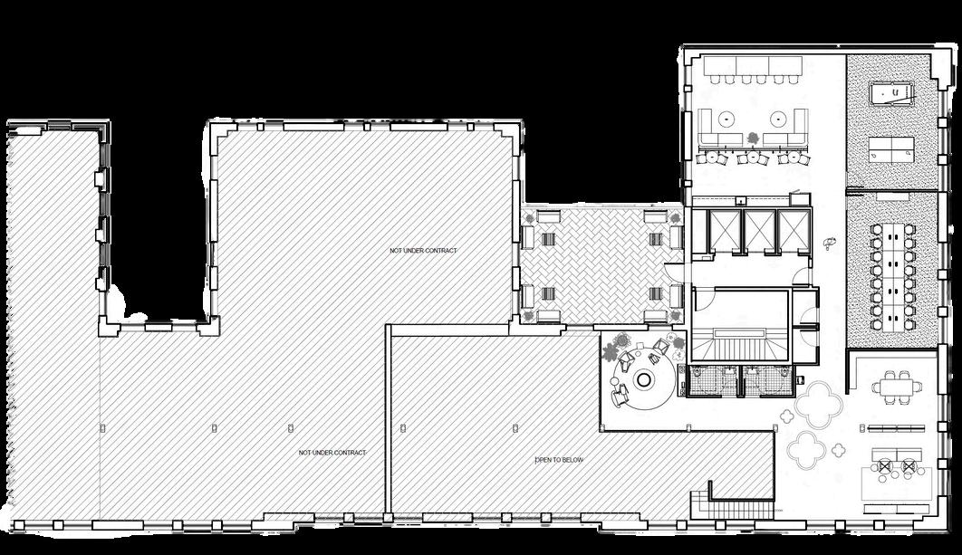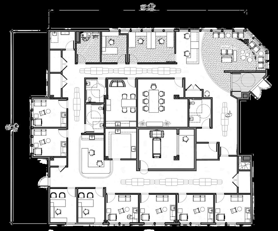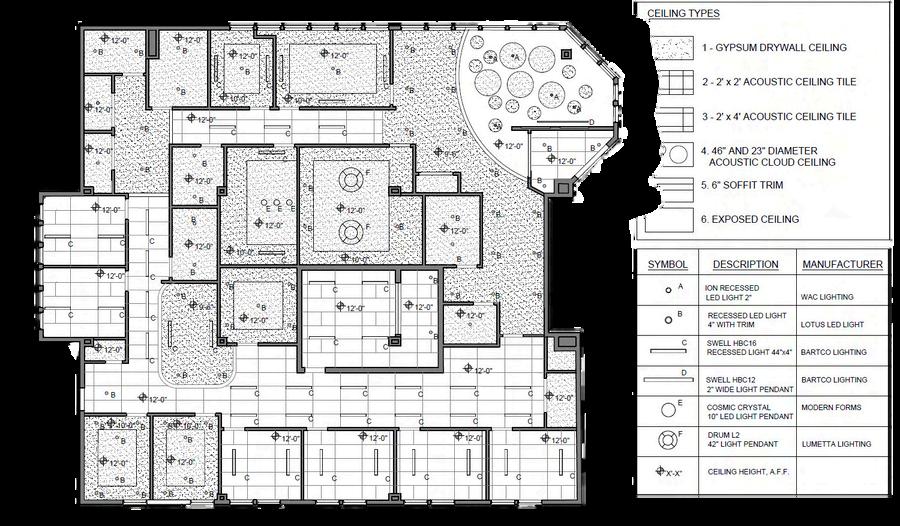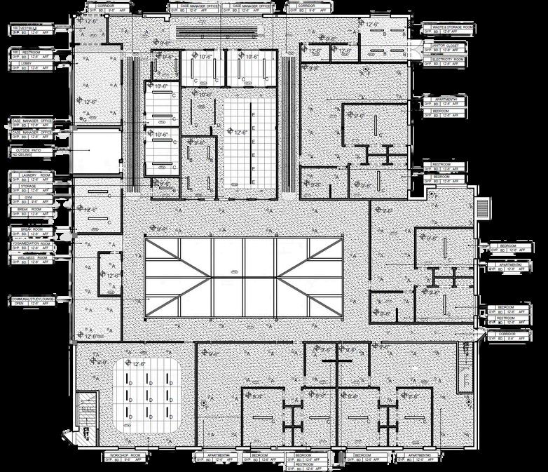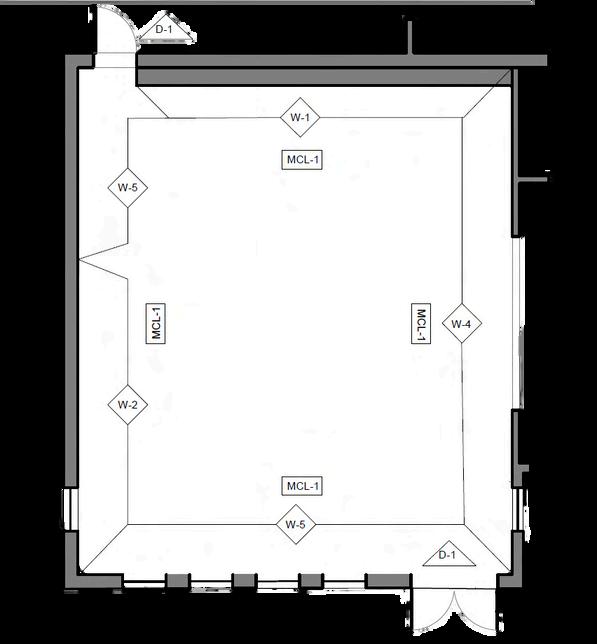 A reflected ceiling plan (RCP) is a type of architectural illustration depicting the ceiling of a space and the selected fixtures that are used in a plan. In this project, the task involved devising a lighting strategy for the Communal Study/Lounge, a multifunctional space intended for recreation and socialization, promoting independence among residents. Positioned in the middle of the plan, this space lacks access to natural sunlight. Introducing a skylight proved a solution in addressing this challenge, facilitating the infusion of natural light.