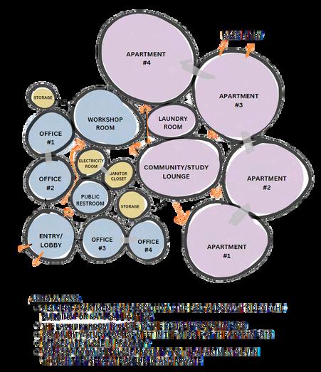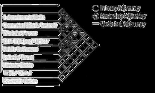 Part of the Schematic Phase for this project was to curate visual diagrams that analyze the space planning around the existing building. Adjacency Matrices, Color Zonings, and Bubble Diagrams solidify this process. An Adjacency Matrix is a table displaying the recommended and discouraged proximity of different spaces on a floor plan. A Color Zoning Diagram separates the public and private areas. And Lastly, A Bubble Diagram is a basic, informal sketch illustrating spaces within a floor plan using circles, colors, and lines to indicate their connections.