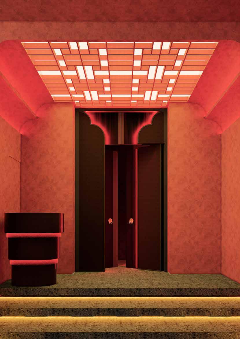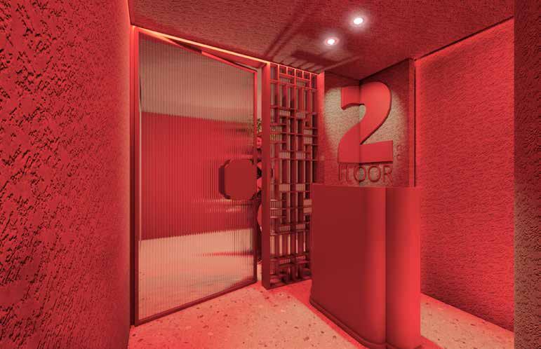 This building has 2 accesses for the bar and lounge, the lounge access which is the primary door is made quite a contrast from the 2nd floor bar access next to it. The primary access is made into a hallway with a Chinese frame pattern accent on the ceiling. Meanwhile, the bar access itself was made more calm, but we included “hóng sè” lighting as a representation of Chinese colors, the color red was chosen according to the meaning of that color and is often associated with fire. This color symbolizes luck and joy.