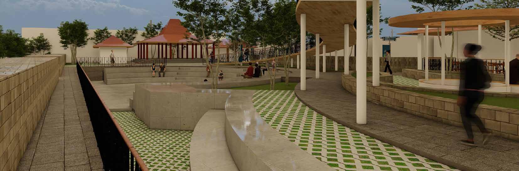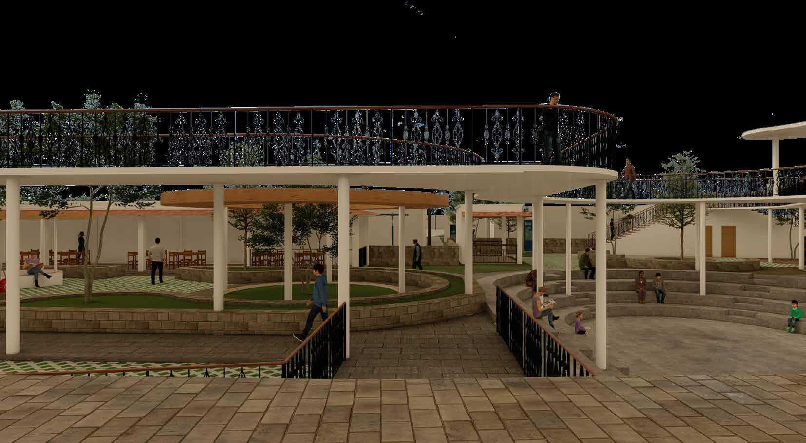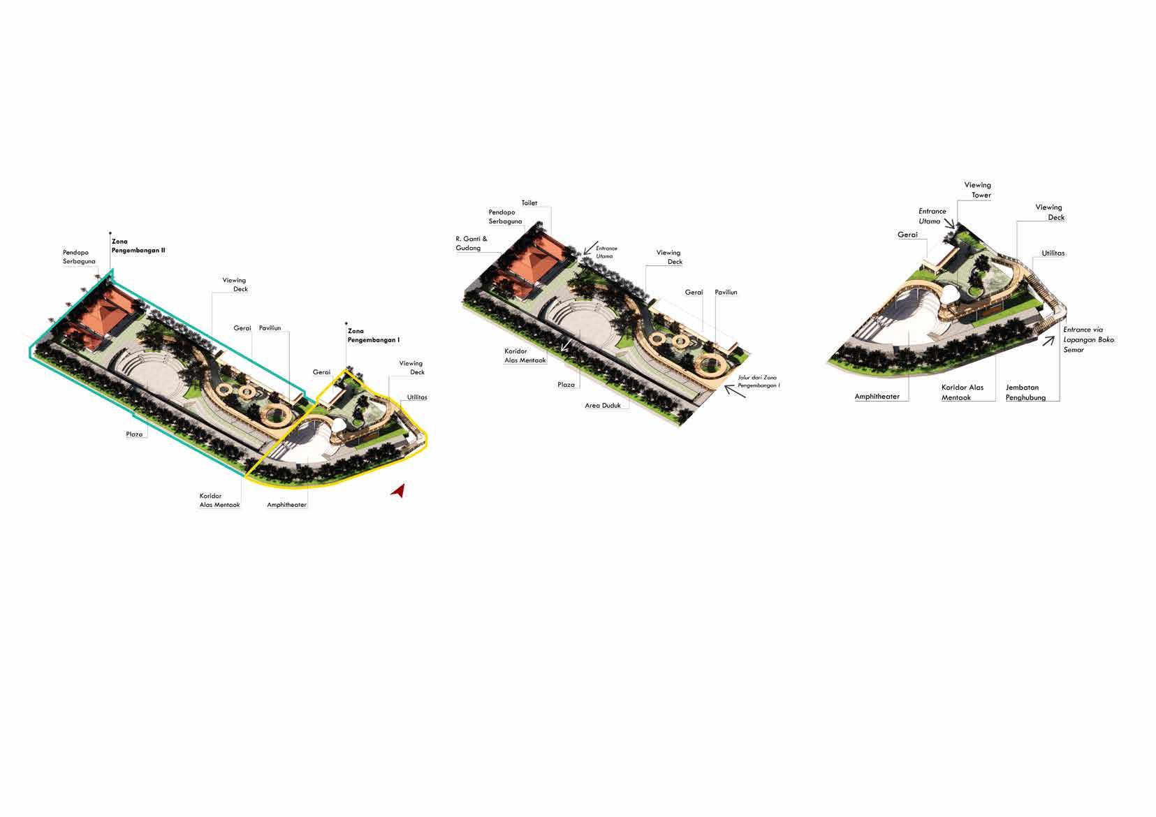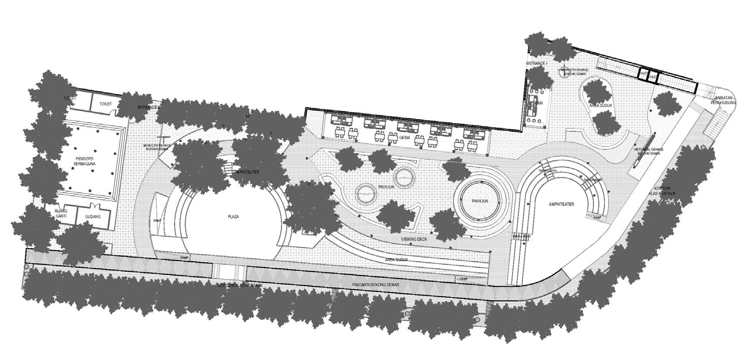 The Zone I design plan focuses on responding to the shape of the fort fragments in the curved Bokong Semar area. The amphitheater is placed in the fort arch area, with fragments of Bokong Semar as the background. The viewing deck was created so that visitors can enjoy the fort from a height.