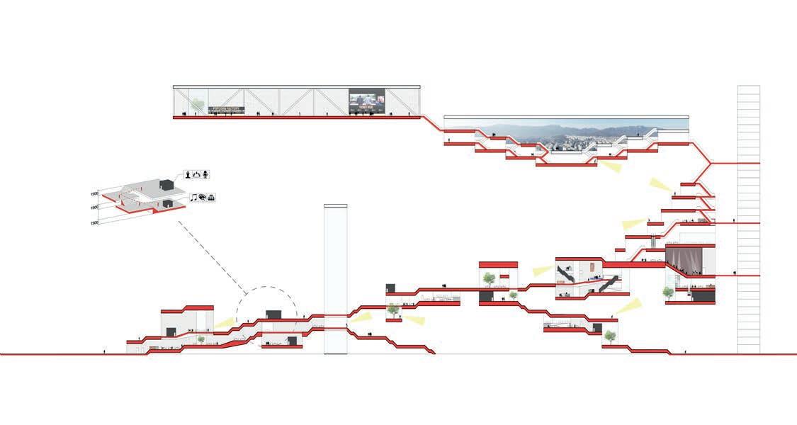 This architecture is consisted of total of 10 stories. The programs are theater, exhibition hall, cafe, bar, bookstore, outdoor gathering, music rooms, rehersal rooms, library, auditorium, and administration offices. The school has the hierarchy system of organization where it goes from more public to more private from bottom to top. For instance, public theater is located in the celler whereas the administration is located on the top floor. The circulation of the building starts from the spiral ramp located on the corner of the architecture. The ramp is also divided at the 4th floor which is where the private part of the programs starts.
