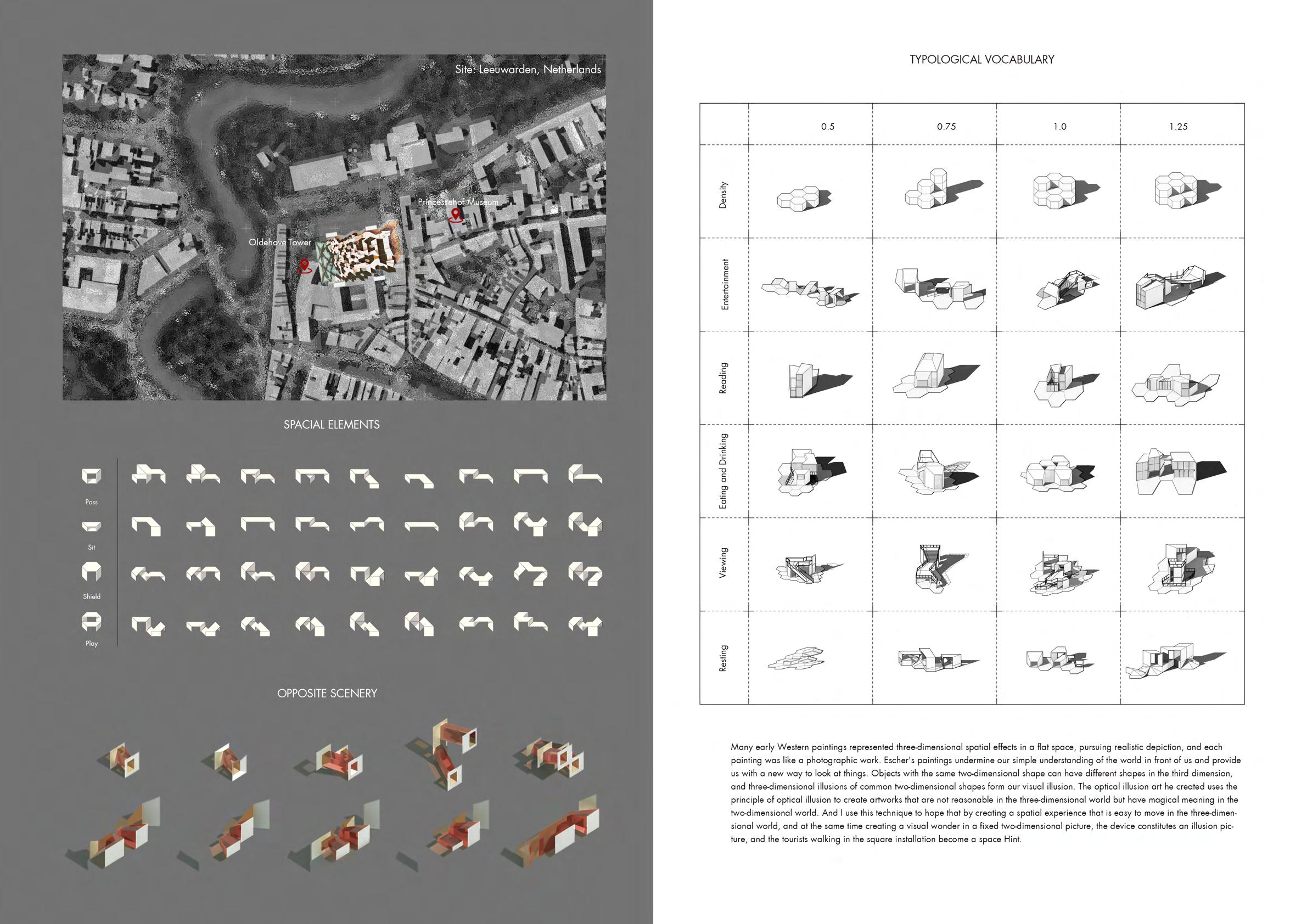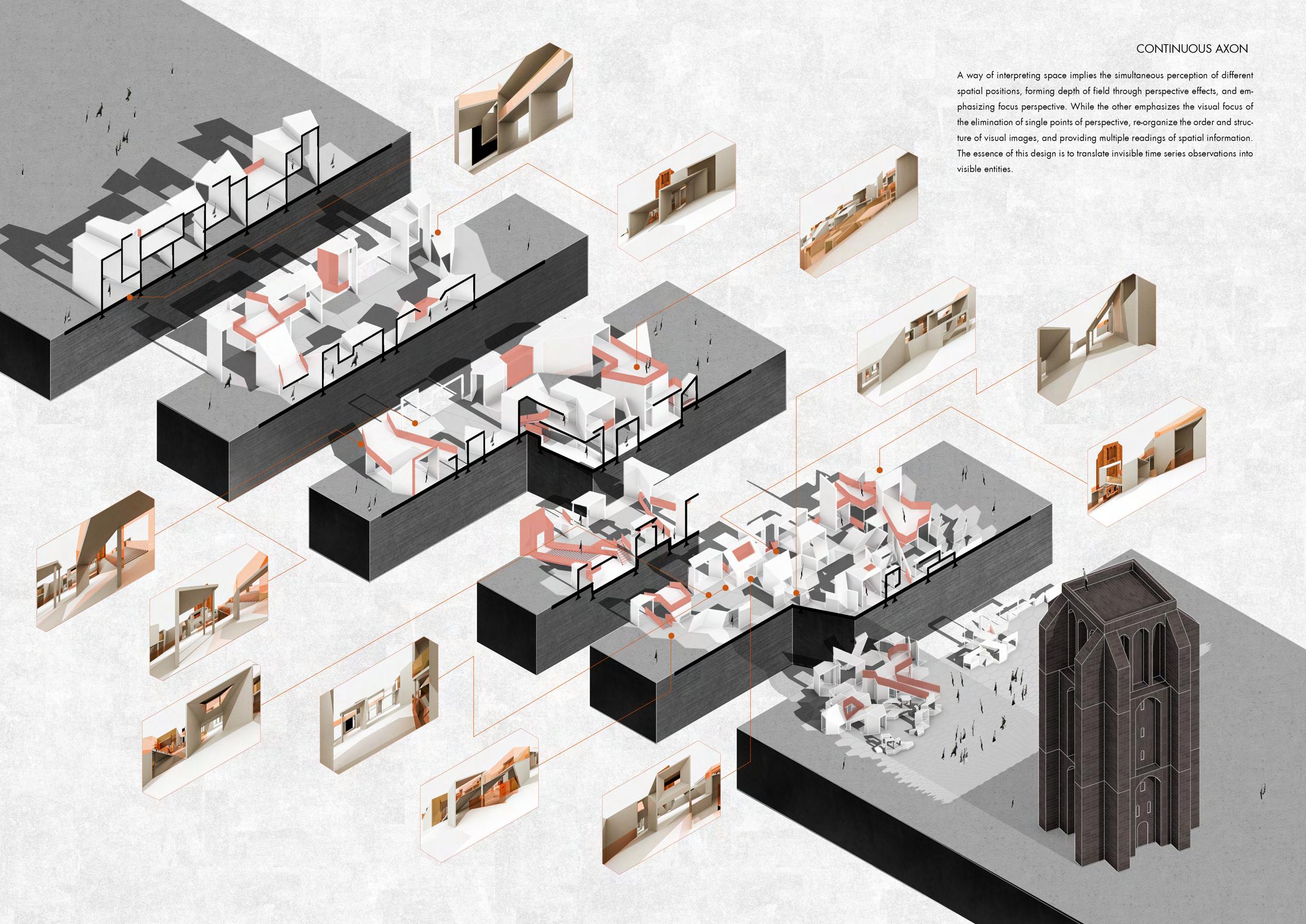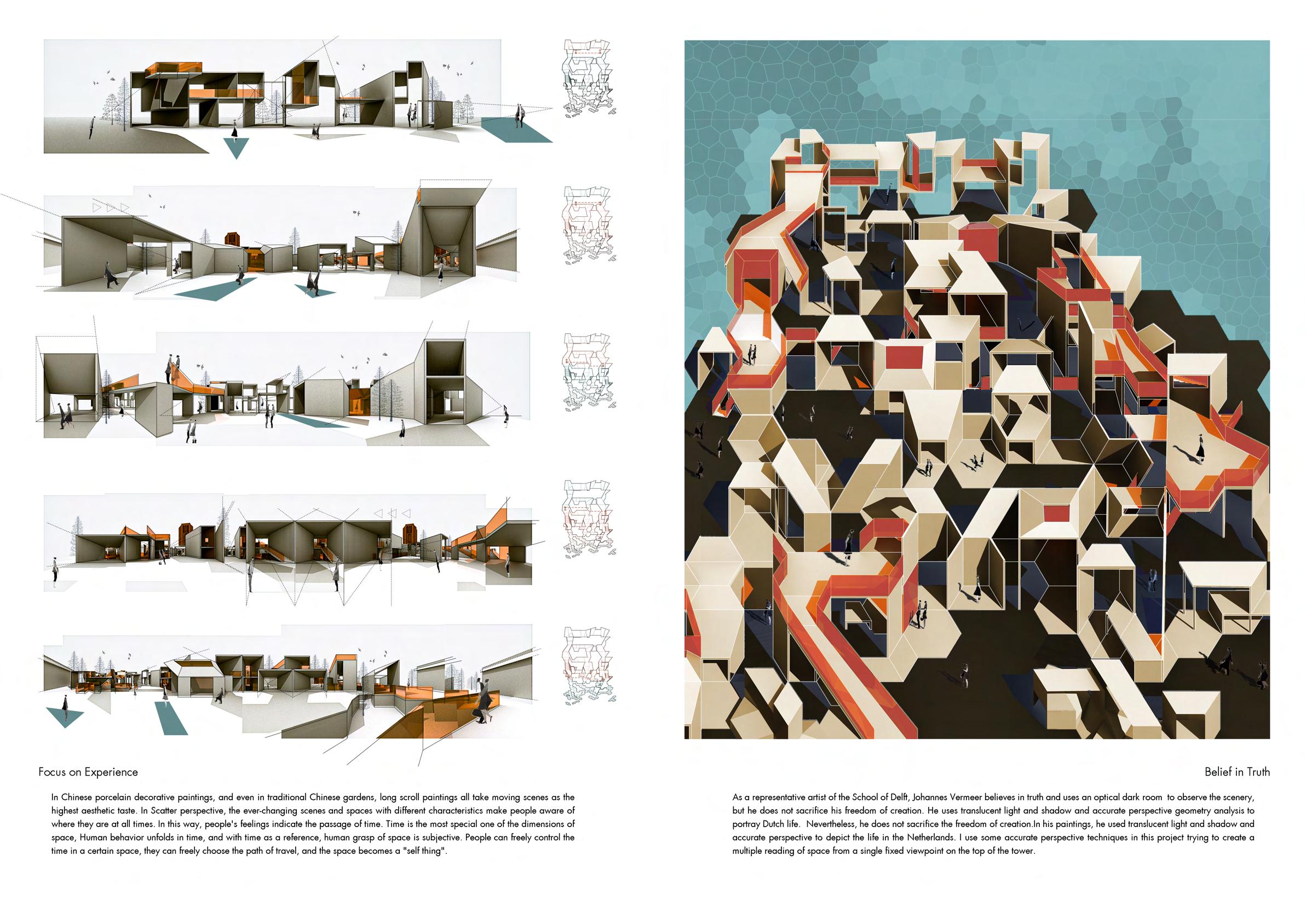 The viewpoint at the top of the Oldehove tower in Leeuwarden provides a fixed perspective viewing point based on the Dutch perspective school ’s observation method. Meanwhile, walking through the constructed installation in the front square, the scattered point perspective observation method of Chinese long scroll painting can be used to experience a continuous space.