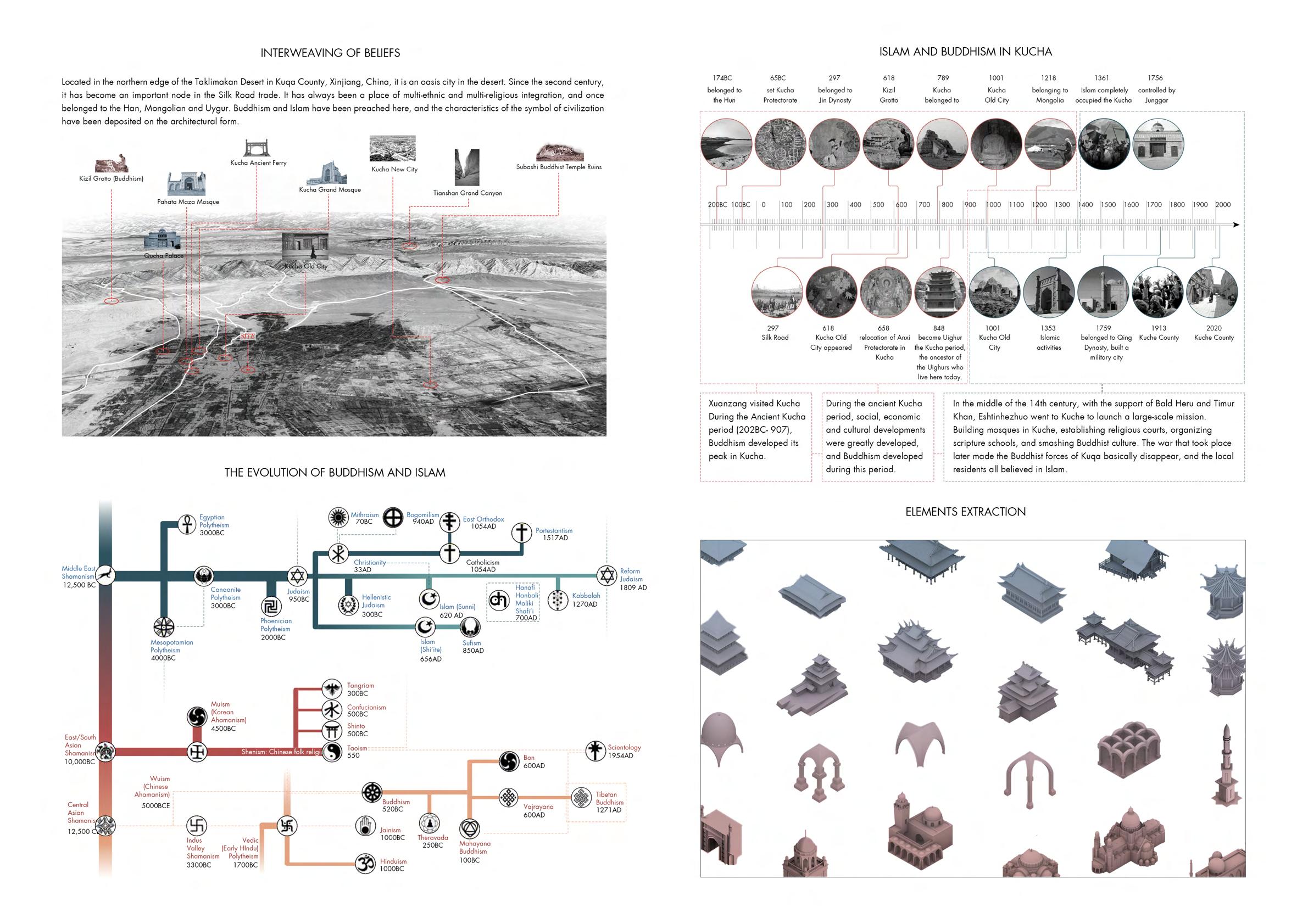 This project extracts geometric elements from religious buildings and re-translates them, concealing the gradual geographical change of architectural symbols in a religious museum located in a multi-ethnic, multireligious and coexisting place in Xinjiang, China. It is used to express that culture and religion are gradual in terms of geography, rather than opposite in nature.