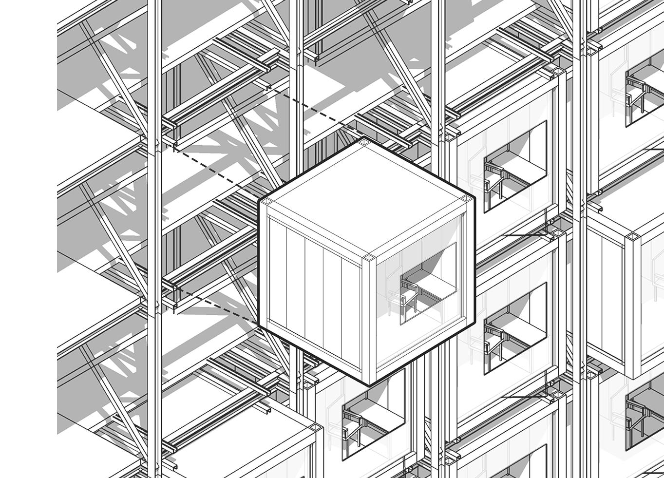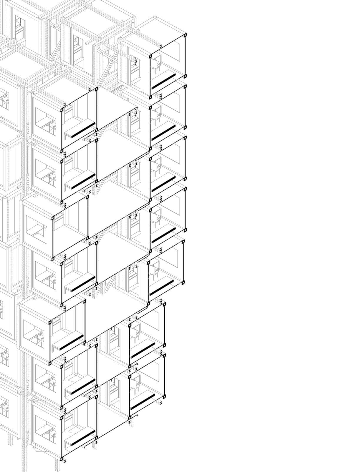 These capsules offer students an avant-garde living experience, seamlessly meeting all their needs in a compact, personal space. With mobile capsules choreographed to create a dynamic architectural narrative, this design embodies efficiency and fosters privacy, allowing students to thrive in their environment.