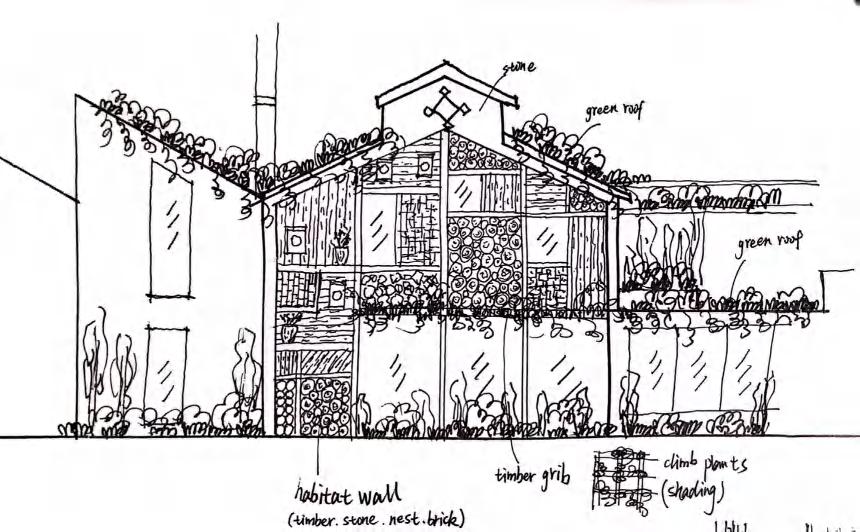 Establishment of an EcoGazebo and introduction of landscaping elements such as habitat wall and plants, and interior renovation.