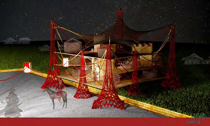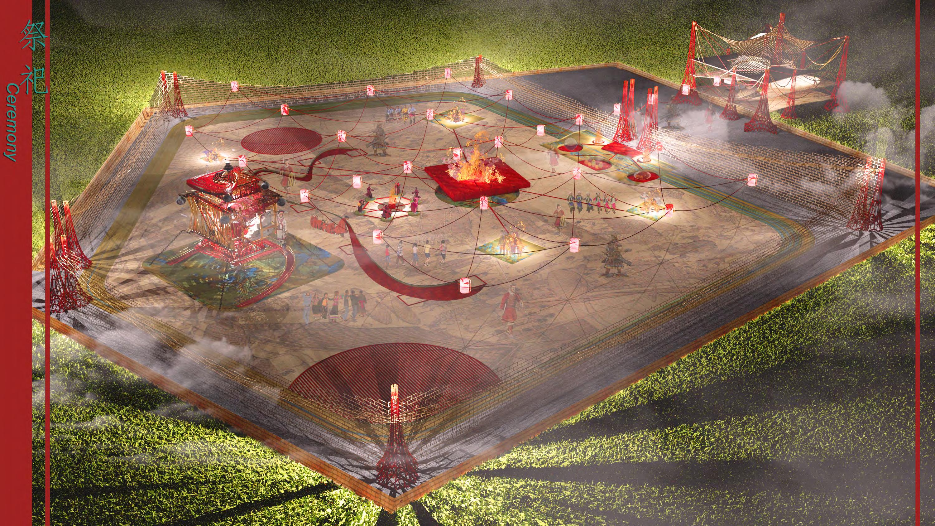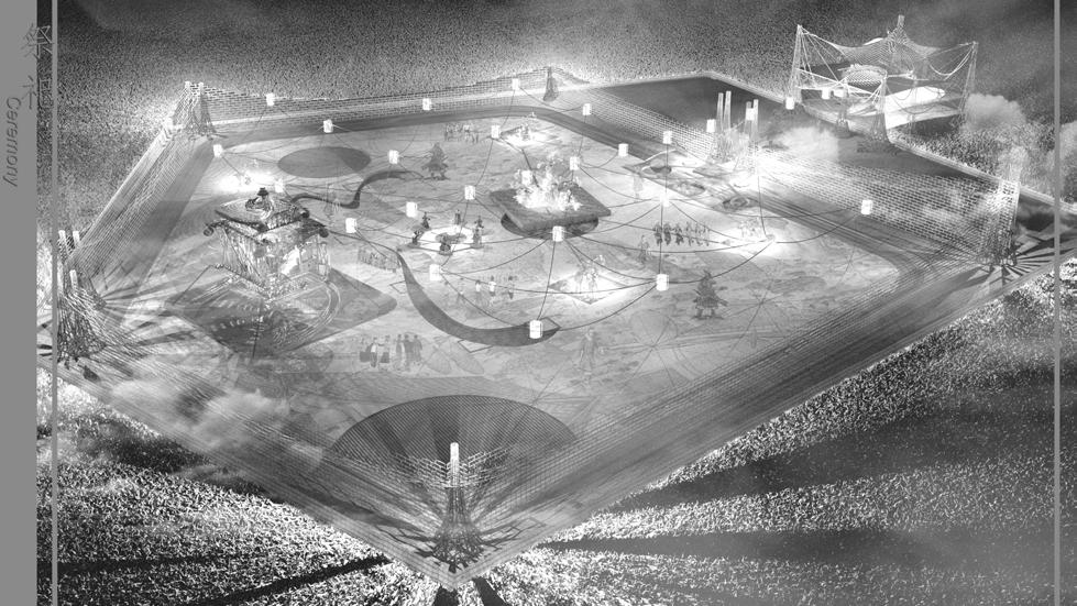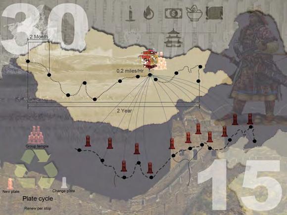 The purpose of the ceremony embassy is to send the souls of soldiers who died on the Great Wall of China back to their homeland so that they are not buried under the ground of the Great Wall. Since the Great Wall has been built by 15 dynasties in China, it lasted 2000 years. My project has a cycle of 2 years, 12 stops, one stop every two months, a speed of 0.2 miles per hour, a total length of 20,000km, spanning the entire Mongolia, which lasted 30 years, and sent these soldiers who died in foreign countries we go home. When the burning tower receives the ances-tral plaque representing the souls of the warriors, the burning tower will send the warriors to the Mongolian embassy, the ceremony begins, and the warriors return to their hometown through the ceremony. The burning tower then proceeds to receive the sign and proceeds to the next stop. This starts the next cycle. When the burning tower leaves a docking station, all ceremonial objects will be removed, and grass will be replanted to welcome wild cattle and sheep from the local area. When the tower returns to this embassy two years later, the ceremony belonging to the next dynasty will come again.
