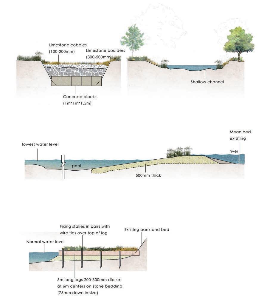 landscape Through the natural river in the site , di erent e ects dominated by water are created in different periods . For example , during the ood season , close the gate to ll the reservoir and the submerged basin , or open the gate to keep the reservoir full . .