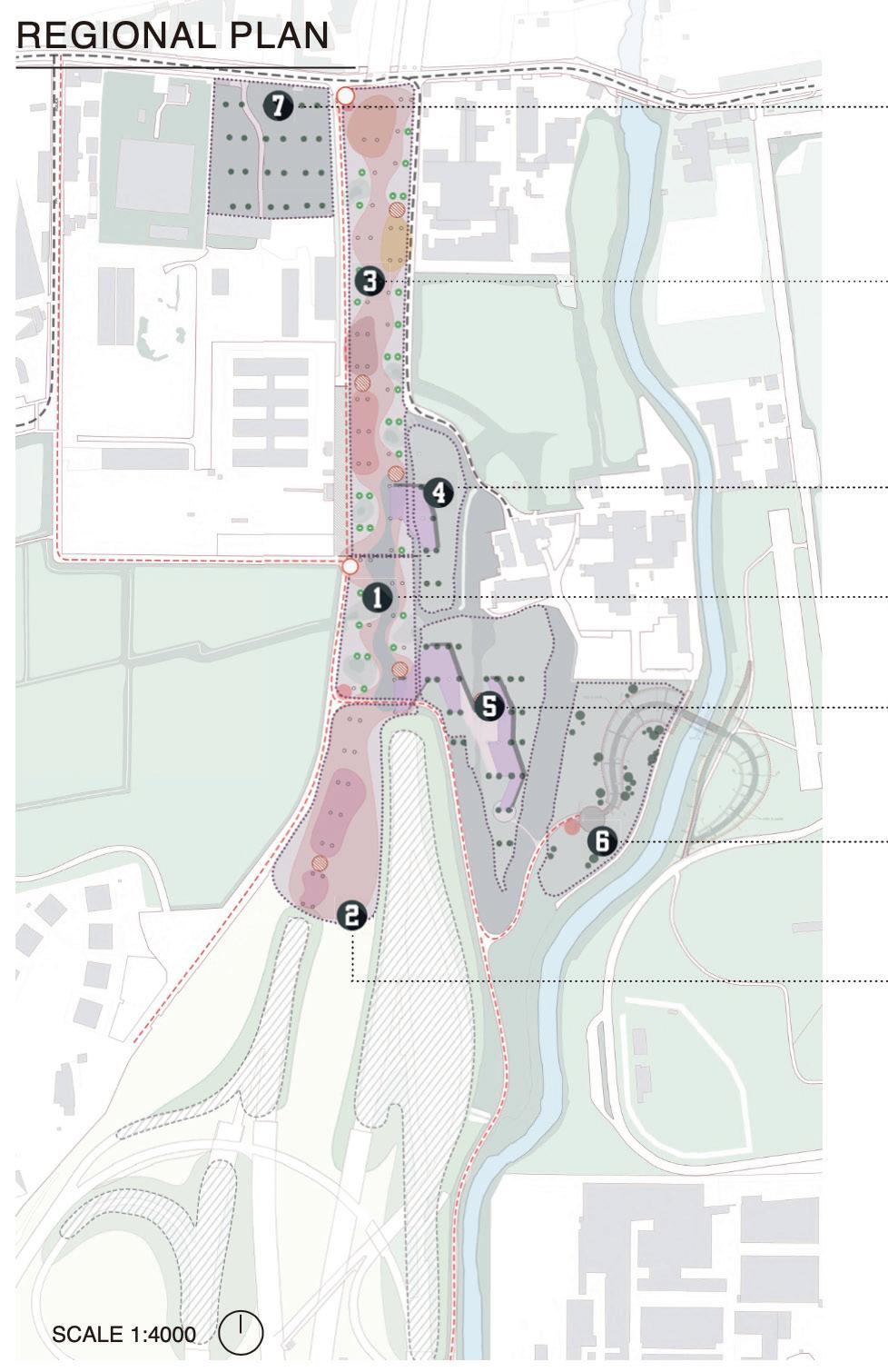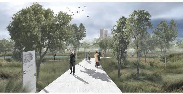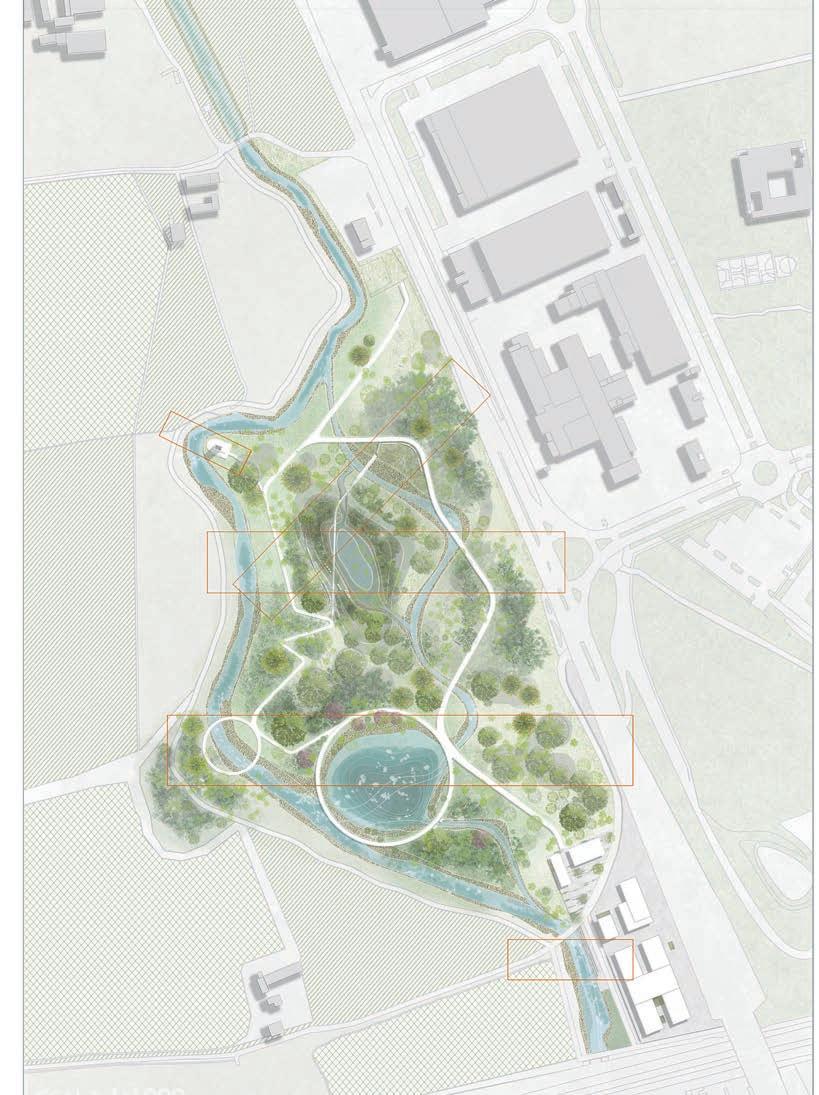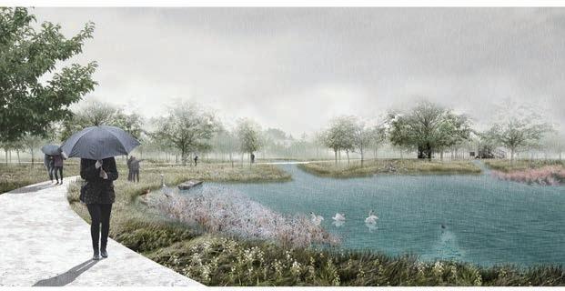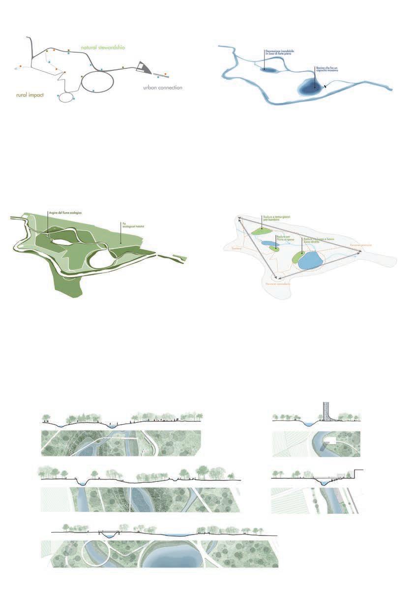 Melzo is located in the southern part of Morgora which is a flood prone area, our site focuses on soil and water conservation, increasing deviation and sharing the damage caused by rising water levels during oods. At the same time, the change in the water level increases the deformability of the landscape. Flexible landscape planning and design can help communities cope with periodic or continuous ooding and adapt them to new lifestyles. System-based design strategies are far more important than individual projects. These systems are composed of protected and strengthened ecosystems, which can be used as natural channels and bu er zones; parks and open spaces ensure the safe passage of water, while storing excess rainwater for future use; a robust green infrastructure system can also help communities manage water resources more effectively. The interior of the park includes a large number of open green spaces, lled with forests, wetlands, lakes, grasslands, streams, bridges, trails and walks, and its size makes for dramatic exhibits. It has formed a rich climate and geological features, laying the foundation for biodiversity and the diversity of the site makes continuous landscape possible.