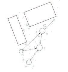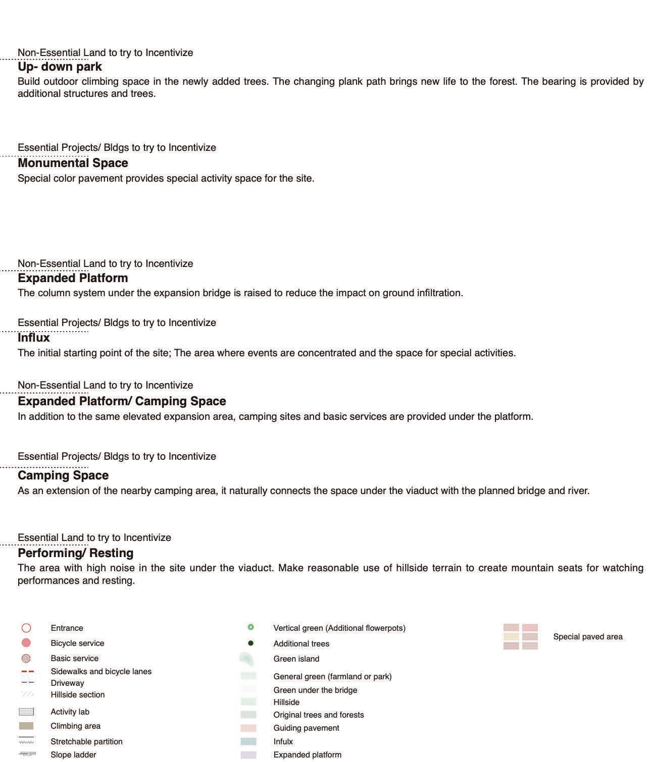 Three path structures of the landscape park , including the main landscape road , the recreational road along the river , and the forest connecting path . The dots of di erent colors represent : interaction with water , interaction with nature , interaction with facilities .