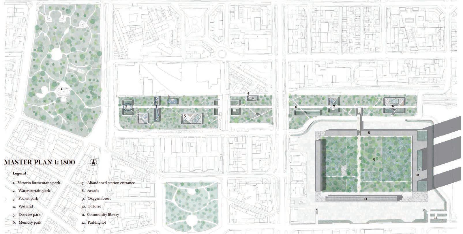 We redesigned the existing abandoned green space and transformed it into a sustainable linear park. And retain the design of the building and the new building, as well as the design of the three towers. It not only preserves the memory of the site, but also adds new vitality to the city of Milan and solves part of the social housing problem.