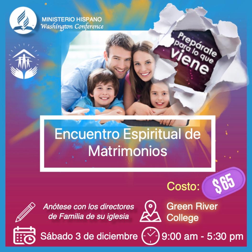 El sábado 3 de diciembre tendremos el ENCUENTRO ESPIRITUAL DE MATRIMONIOS, en el Green River College, de 9:00 am a 5:30 pm. Es un evento organizado por el área de Hogar y Familia de la Conferencia. Inscripciones con los directores del ministerio de la familia.