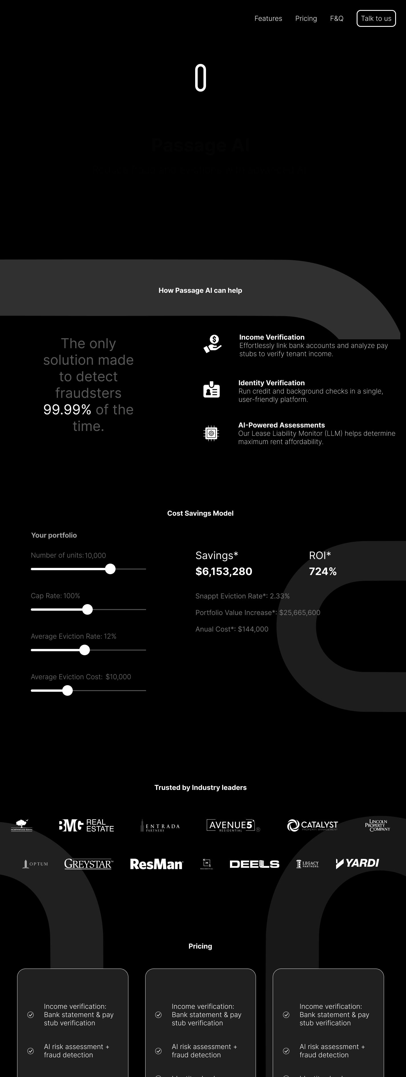 Passage AI is a fintech startup focused on solving the challenges of fraud detection and tenant qualification. The platform harnesses the power of machine learning and data analytics to provide accurate, efficient, and secure solutions for financial institutions and property management companies. Design a landing page and company identity for the startup to prototype customer sign up.