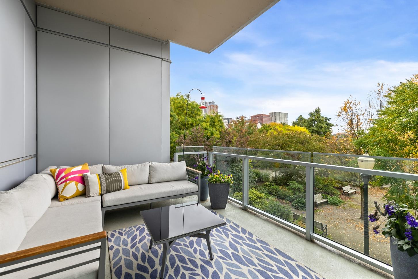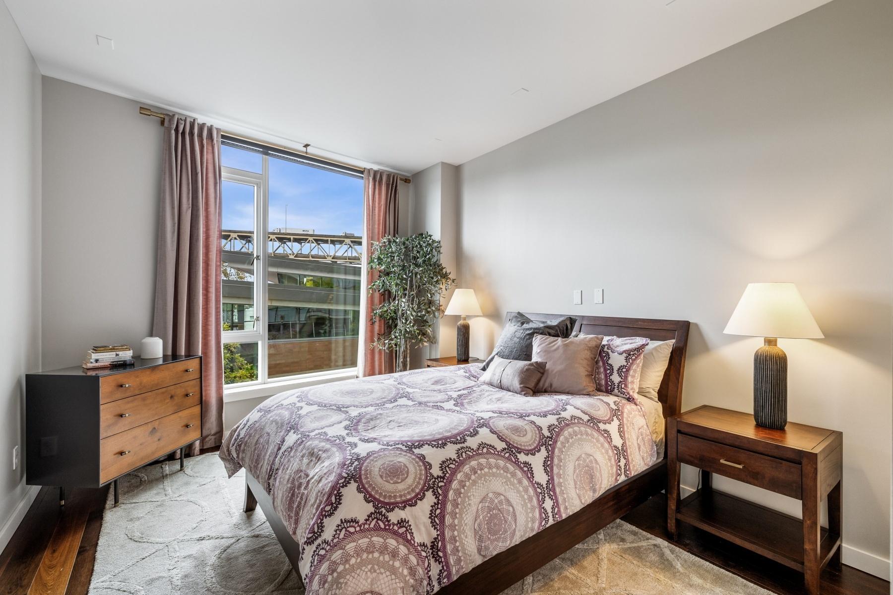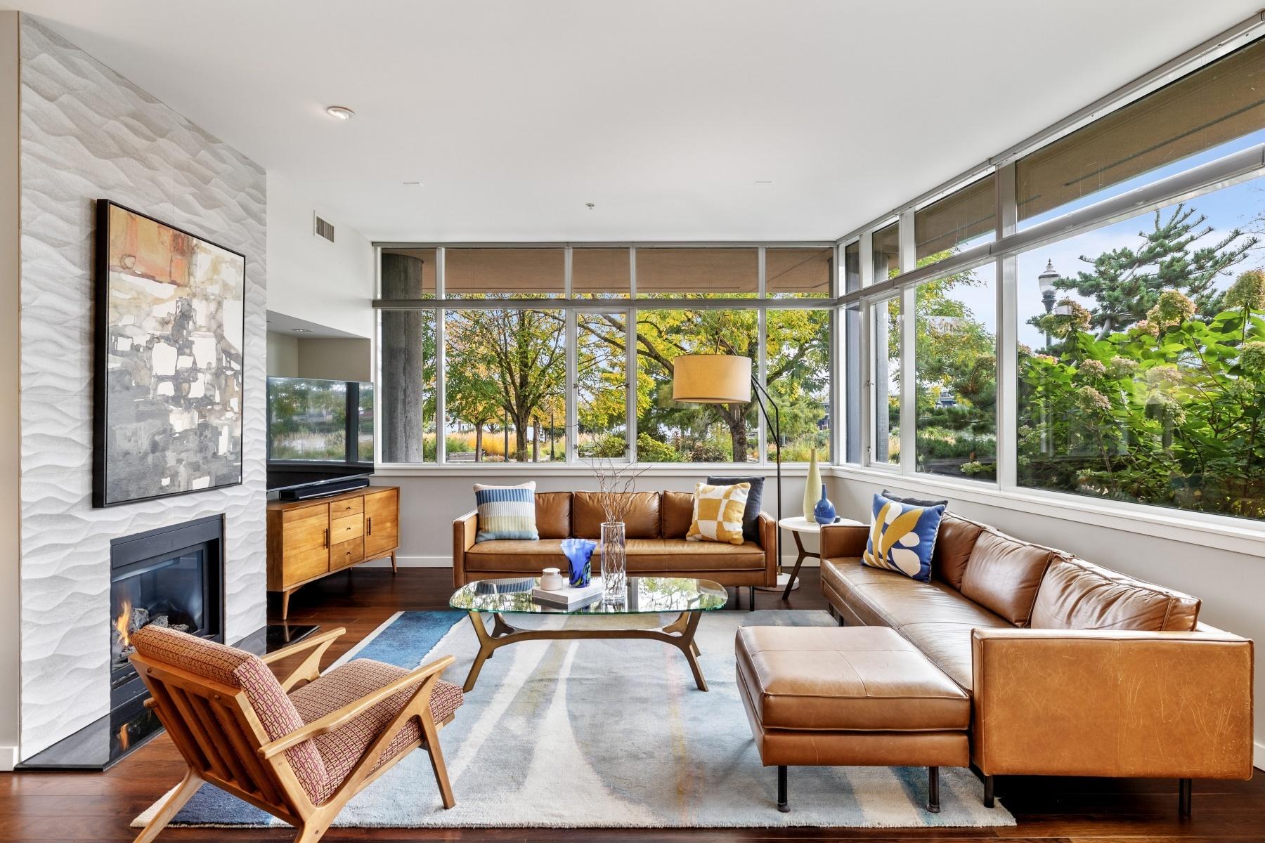 Designed for elegance and convenience, the residence features a generous open floor plan, with 10' ceilings and 180-degree views from the wall of windows infusing the unit with natural light Tailor this space with flexible living and dining areas to resonate with your personal style The main level also includes a Gourmet Kitchen, full bathroom, and oversized storage closet in theunit with custom built-ins.