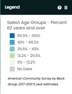 Many Arizona seniors reside beyond the urban setting. In Youngtown, Sun City, Sun city West and parts of Wickenburg, seniors 62 years old and older represent over 69% of the population (2021 American Community Survey). Data from the CDC’s Social Vulnerability Index suggests that many seniors in the Northwest Valley are also struggling with social stressors related to housing and economics (see Figure 3).