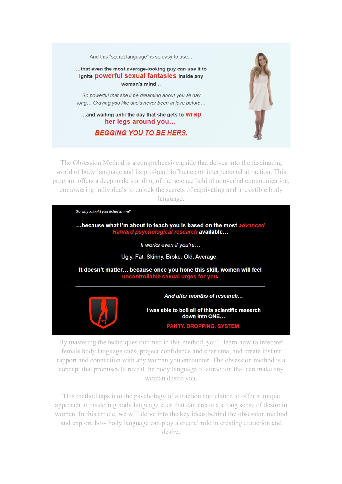 Understanding the fundamental principles of the obsession method begins with recognizing the power of non-verbal communication. The method suggests that certain body language cues can trigger subconscious responses in women, leading to feelings of attraction and desire. For instance, maintaining strong eye contact, using confident posture, and adopting open and welcoming gestures are believed to be key components of this method.Proponents of the obsession method argue that by closely observing and controlling your body language, you can effectively communicate desire and attractiveness to women without saying a word