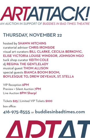 THURSDAY, NOVEMBER 22 hosted by SHAWN HITCHINS curatorial advisor CHRIS IRONSIDE visual art curators BILL CLARKE, CECILIA BERKOVIC, ELISE VICTORIA LOUISE WINDSOR, JOHNSON NGO tuck shop curator KEITH COLE dj REGINA THE GENTLELADY musical guest THOM ALLISON special guests BIANCA BOOM BOOM, BOYLESQUE TO, DREW DEVEAUX, ST. STELLA VIP Reception 6PM Preview + Silent Auction 7PM Live Auction 8PM Sharp! Tickets $25 | Limited VIP Tickets $100 box office: