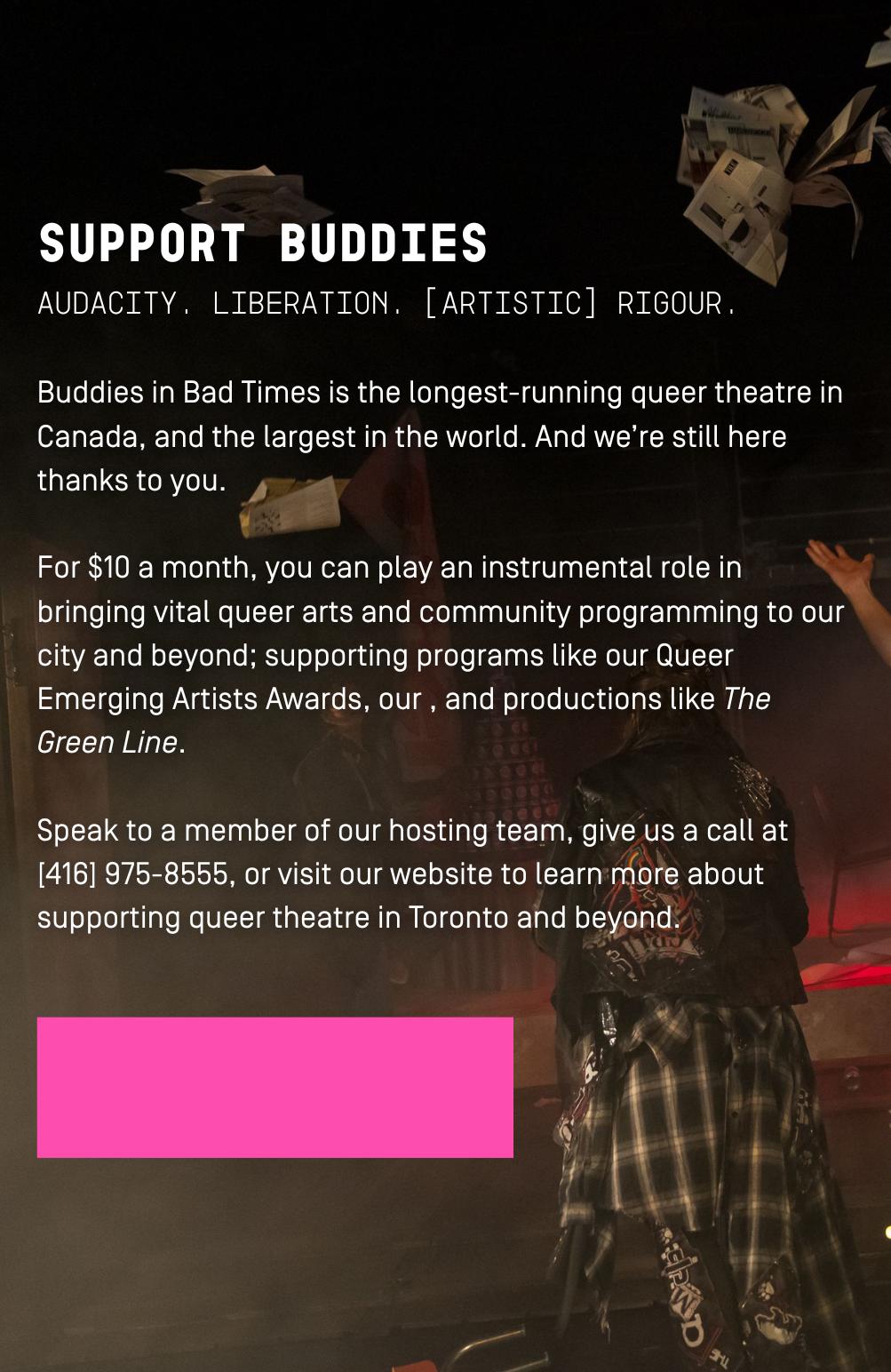 Buddies in Bad Times TheaTre is siTuaTed on The lands of The haudenosaunee, The anishinaaBe, and The WendaT, and The TreaTy TerriTory of The mississaugas of The CrediT. We aCknoWledge Them and any oTher naTions Who Care for The land (aCknoWledged and unaCknoWledged, reCorded and unreCorded) as The pasT, presenT and fuTure CareTakers of This land, referred To as TkaronTo (“Where The Trees meeT The WaTer”; “The gaThering plaCe”). Buddies is honoured To Be a home for queer, Trans and 2-spiriT arTisTs on These sToried and saCred lands ThaT have Been sTeWarded By Indigenous peoples for Thousands of years Before The arrival of Colonial seTTlers.