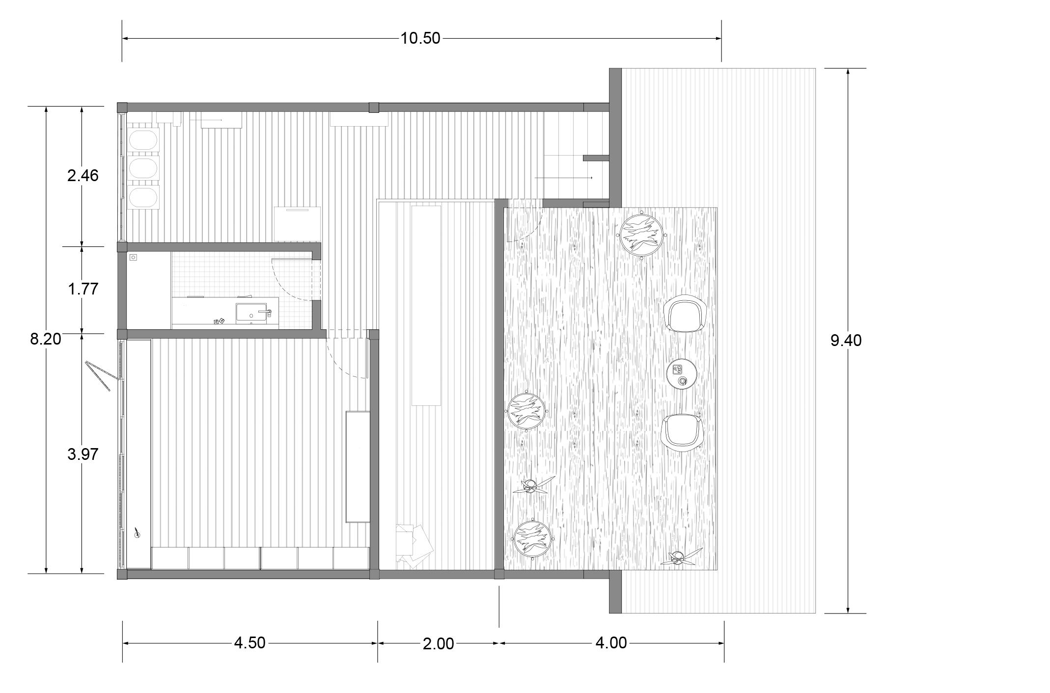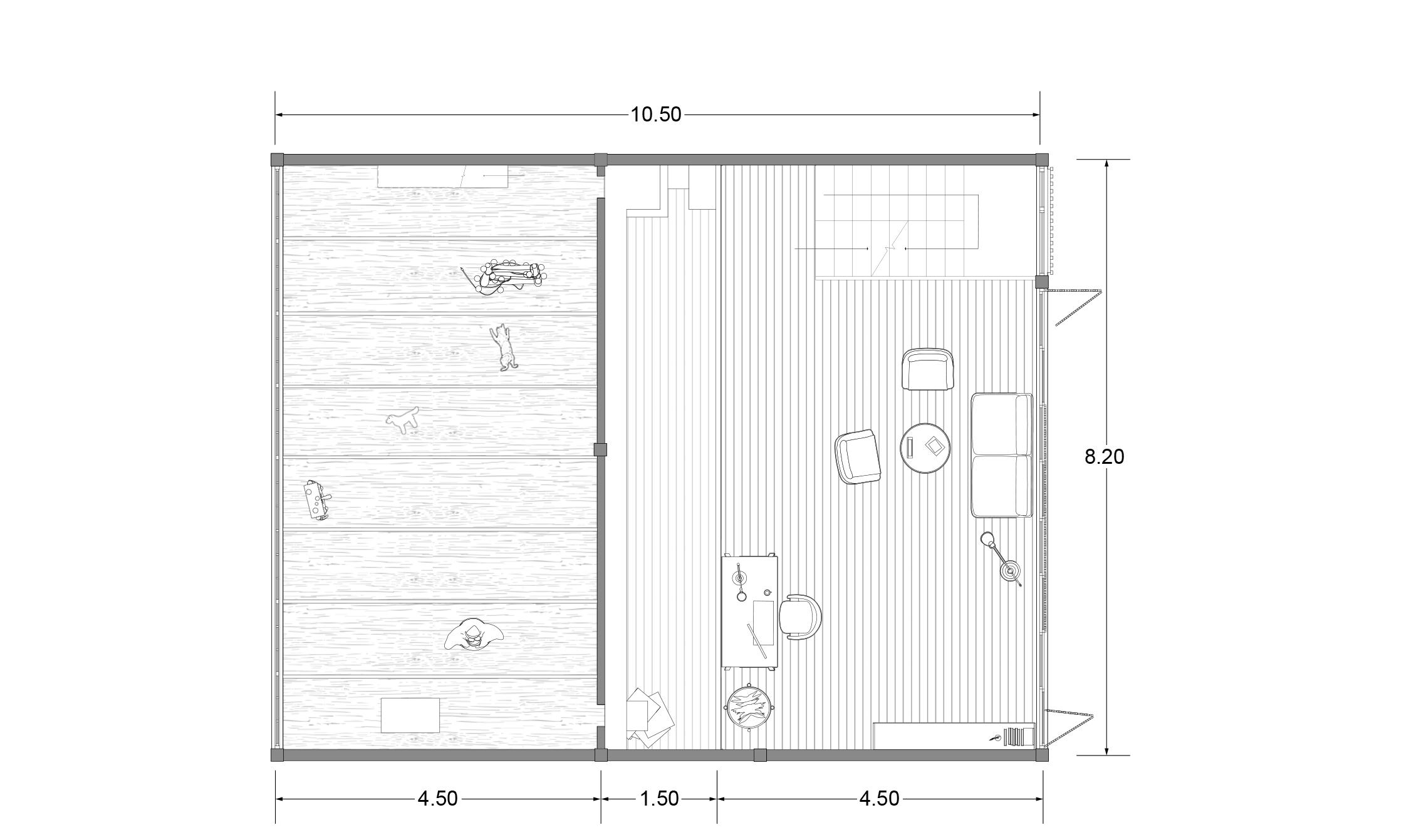 The effect of supporting curved wooden walls is achieved by using columns approximately 0.6 metres wide in the external walls as supports, one at four metre intervals. This support eliminates the need for other supporting columns in between.