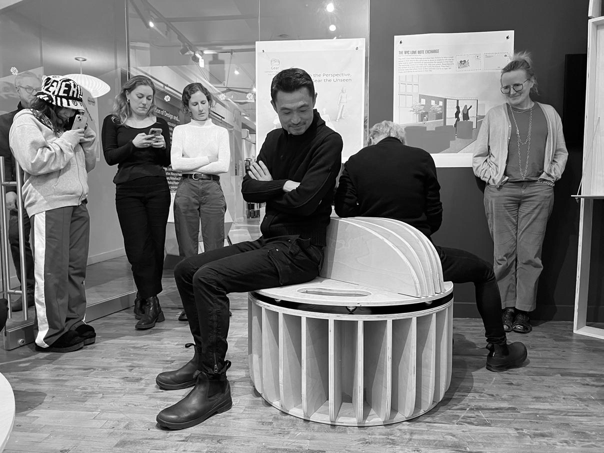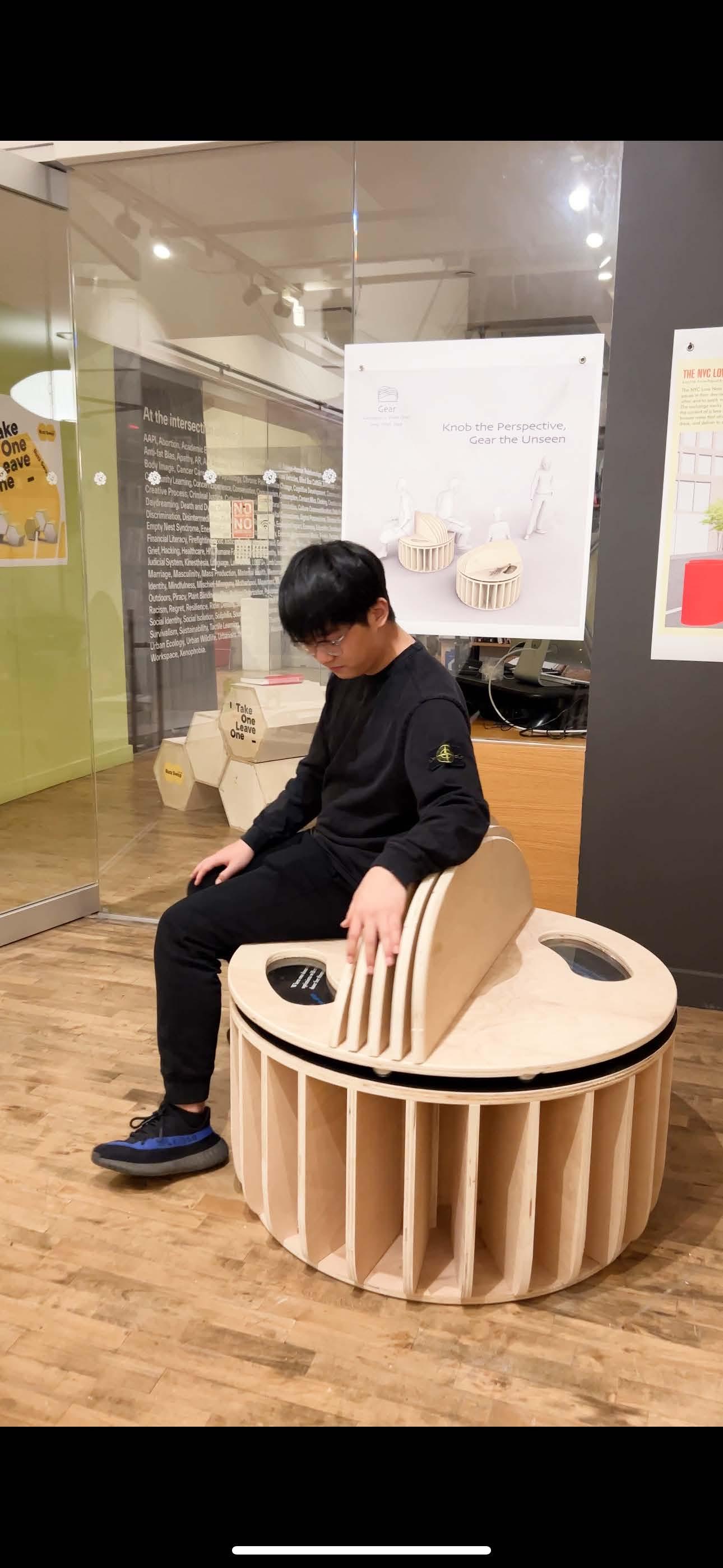 As people pass by, they are drawn to the intriguing design of our seats. Upon sitting down, they discover text-based stories displayed on either side. Quickly realizing that the narrative unfolds across both sides, they are encouraged to explore and communicate with those seated opposite by rotating the seat using their backs and feet.