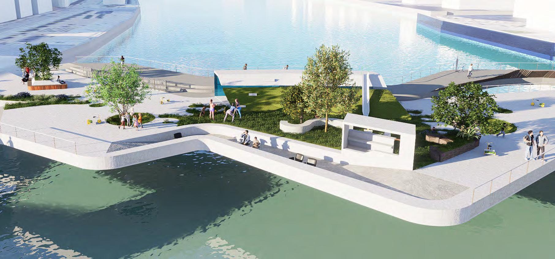 BOTH UP THE BRIDGE AND DOWNWARDS TO THE WATER'S EDGE. CONVEYING THE EXPERIENCE BY WATER. THE WATER SLIDE ENGAGE VIEWERS TO GO UP.