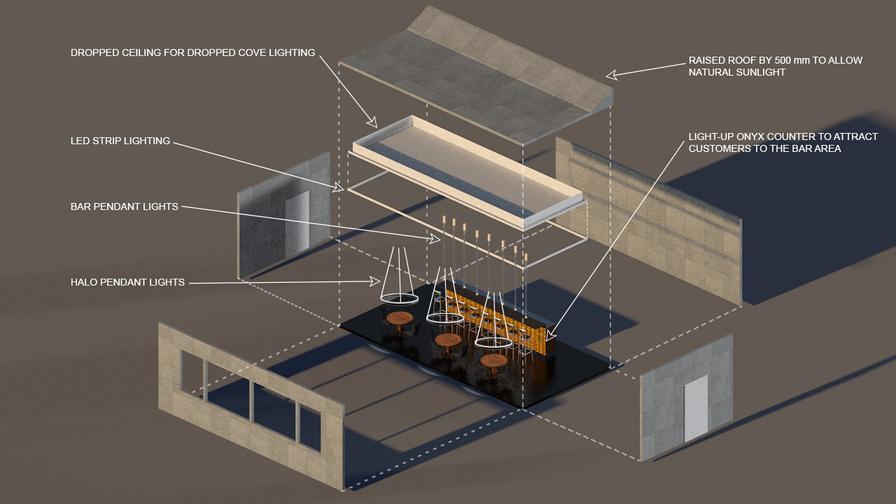 Thebriefforthisprojectwastodesignapopup barinHydeparkwithachosenclient.Theclient, being'backbar'inCollingwood,hasastrong emphasisondarkandambientlighting,solighting choiceswerecrucial.Thedesignincorporates pendantlighting,halolighting,covelighting,as wellasalightuponyxcounter.