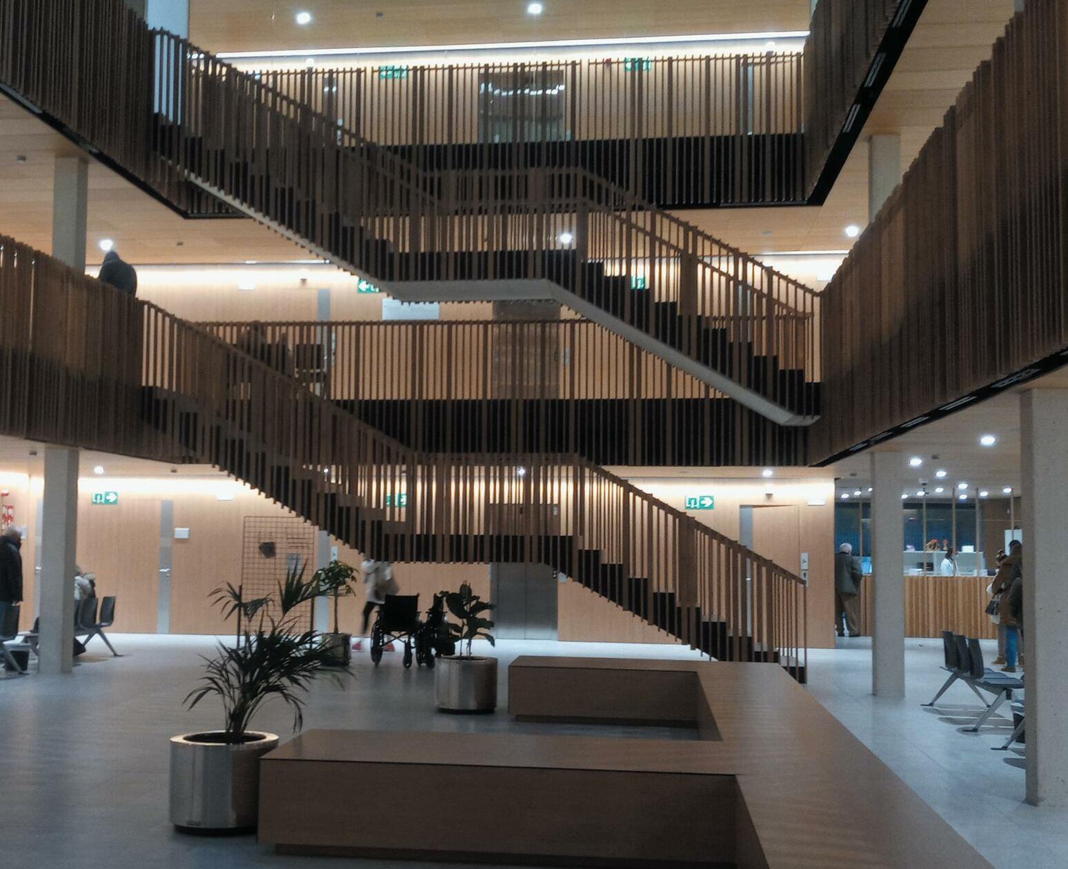 El Centro de Salud de Lezkairu está vertebrado en torno a un amplio patio central interior -342 m2 junto a salas de espera y circulaciones- que es adyacente a las consultas de Pediatría situadas en la planta baja
