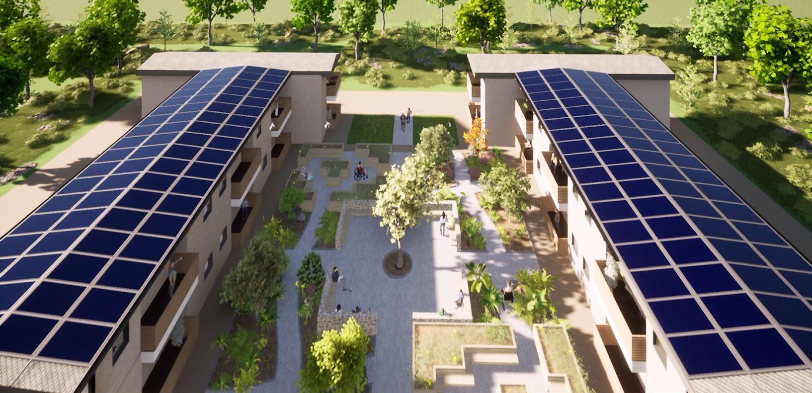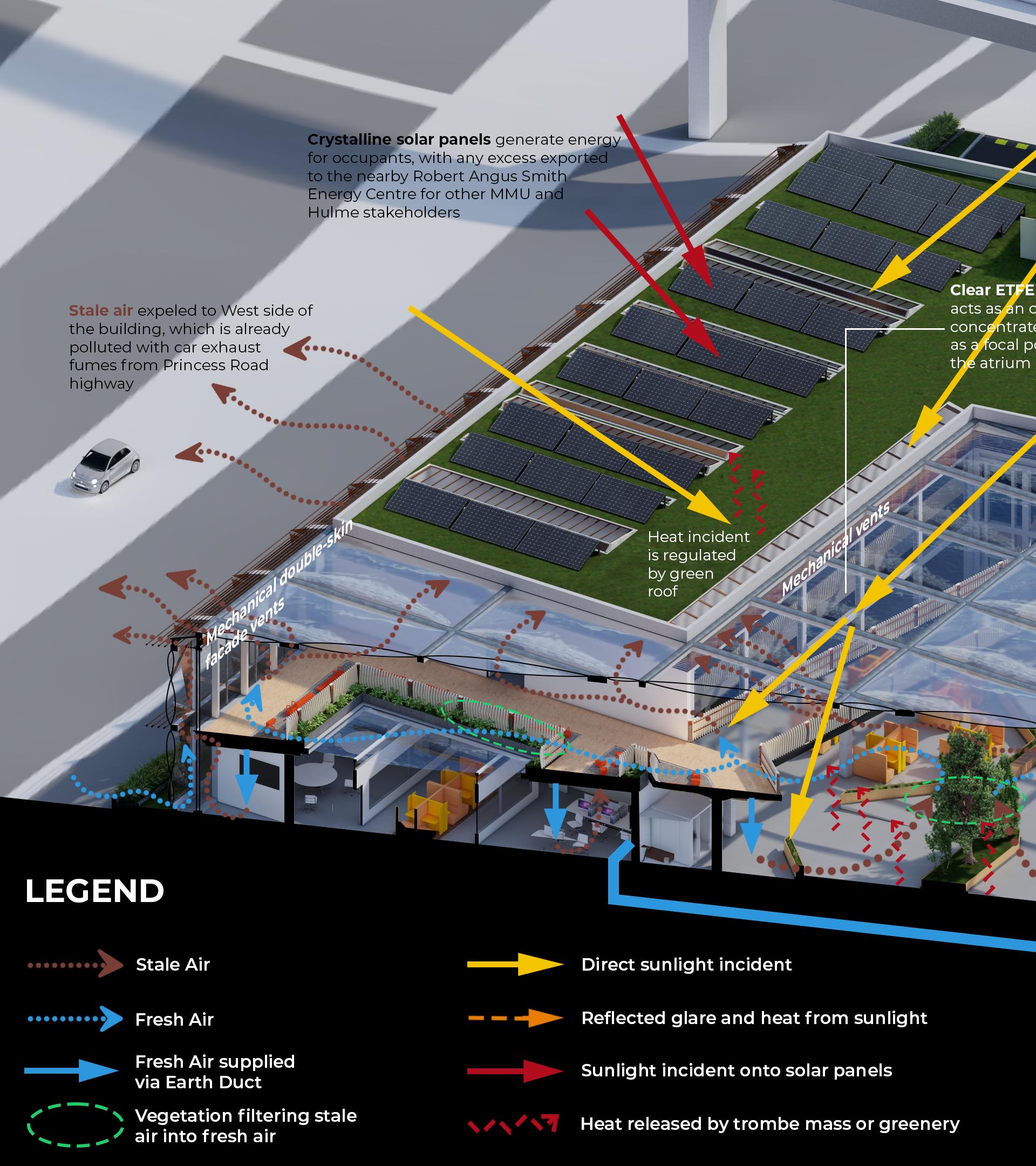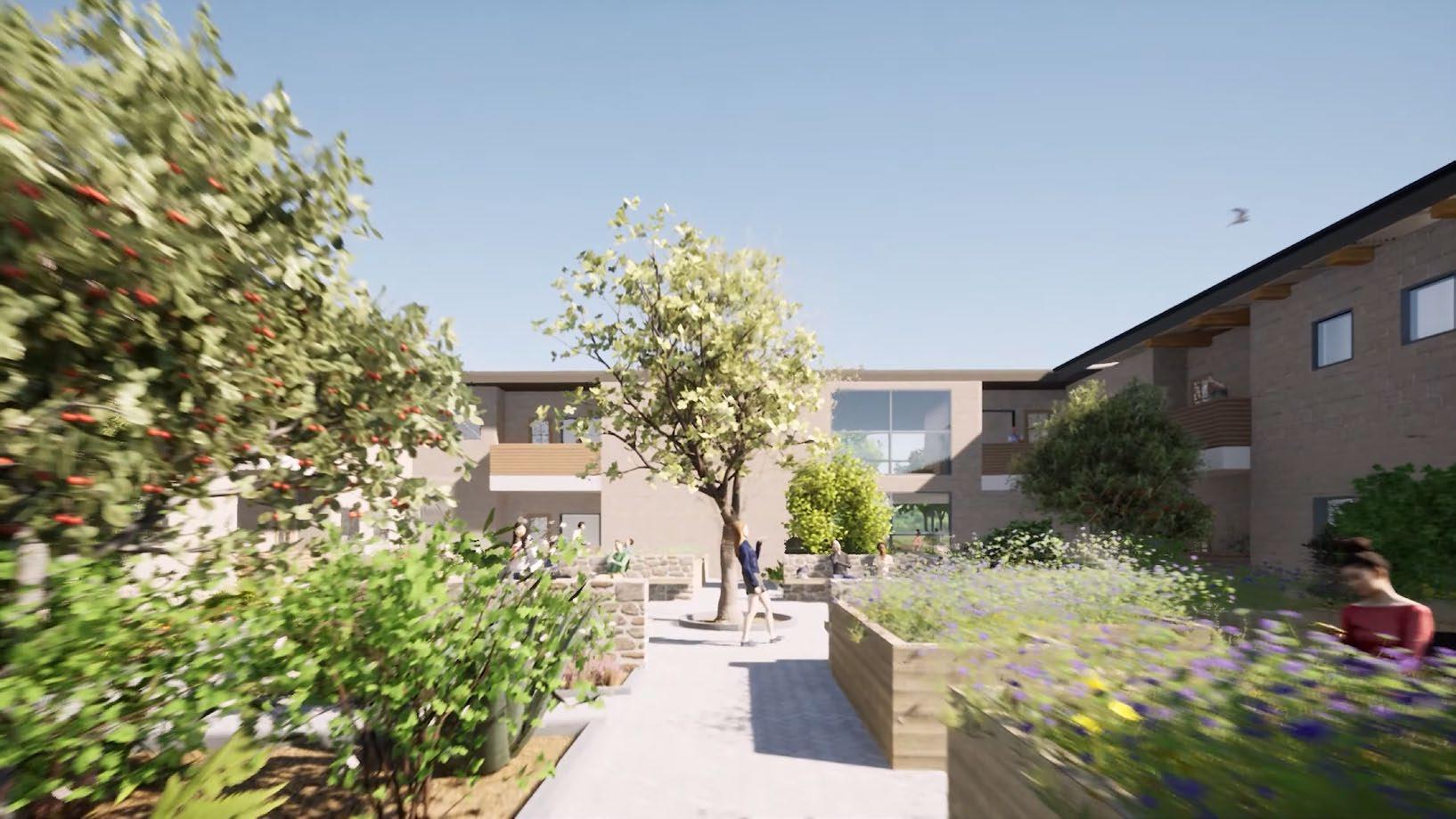 East elevation showing external green terraces and landscaped physiotherapy equipment