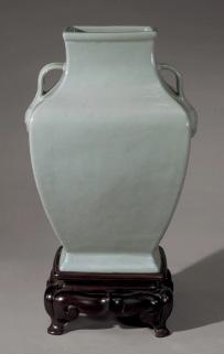 8 A1 CHAMPLEVÉ AND ENAMEL WALL VASE, GUANGDONG TRIBUTE TO THE IMPERIAL COURT, QIANLONG China, 1736-1795. Of flattened form, the gilt bronze baluster body supported on a short spreading foot and rising to a flared neck, the mouth and foot rims are three-lobed. Inlaid at the center with a haitang-shaped and finely enameled plaque neatly painted with two court ladies seated in a lush garden with willows, rockwork, and flowers, one playing the flute. The plaque is encircled by raised kuilong executed in champlevé enamel, the foot and base of the neck with similar kuilong and with an enameled taotie mask below the mouth.
