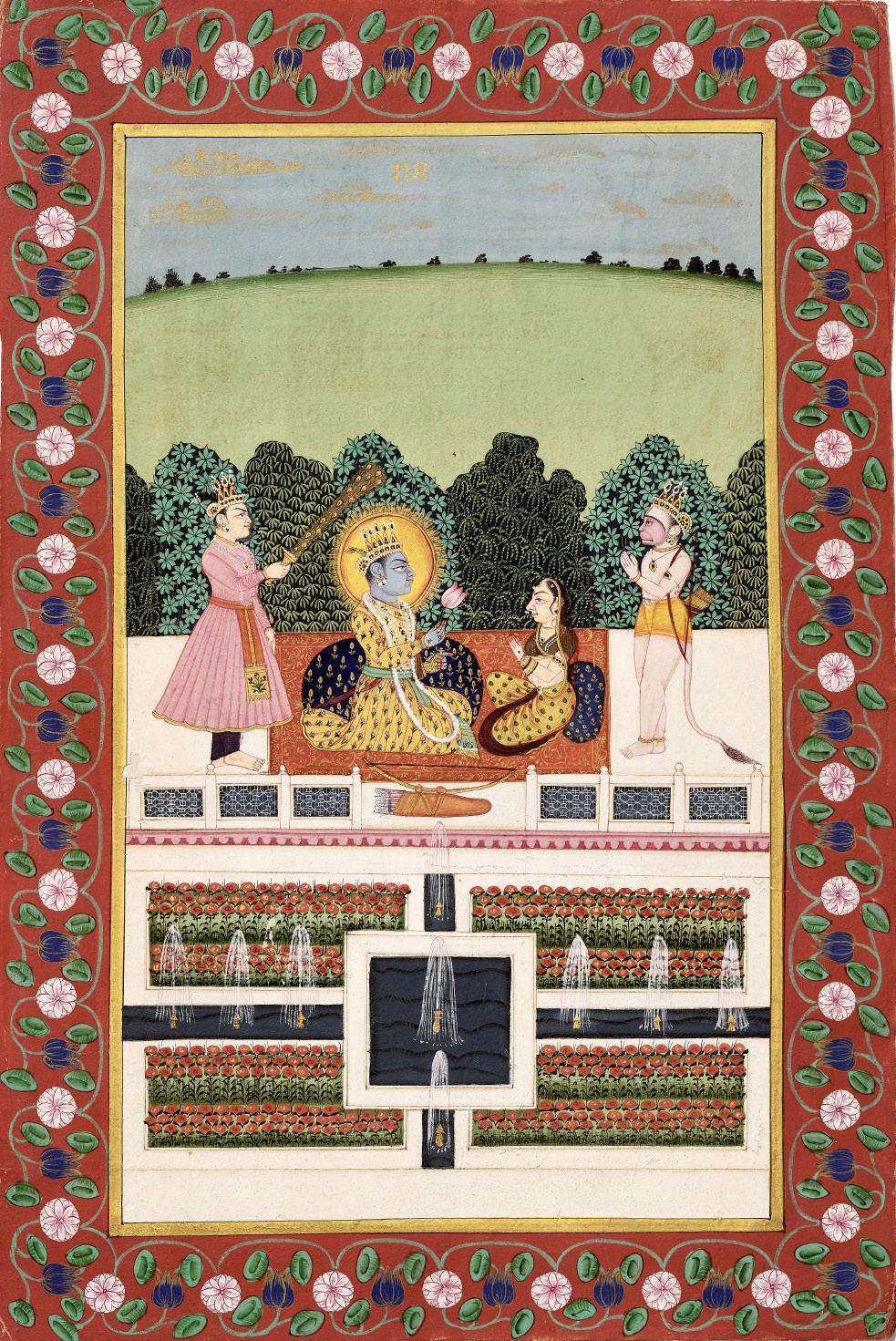 India, late 18th to early 19th century. Ink, watercolors, gouache, and gold on paper, laid down on paper. Finely painted with Rama and Sita seated on an ornate red carpet on a terrace overlooking a charbagh, flanked by Rama’s brother Lakshmana to the left waving a flywhisk and his devoted follower Hanuman to the right. The four figures are dressed in fine jewels and silks, all in a verdant landscape.
