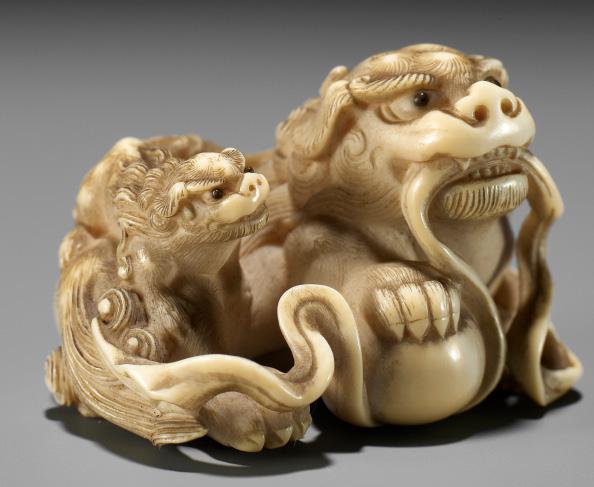Kinko sennin is shown seated on the back of a huge carp with its body arched and tail swinging upwards. Kinko looks up, taking a moment away from reading the contents of his open scroll. The scales of the carp are finely incised, its mouth open and hollowed, and its pupils inlaid with large roundels of dark horn. The ivory with a naturally grown honey-gold patina. Generously excavated himotoshi to the back of the carp and signed to the immortal’s back in faint characters YOSHITSUGU.
