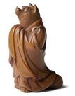 Finely carved as a standing sennin, supporting a writhing snake on his shoulder, one hand grabbing the reptile by its neck and the other holding holding a loose section of his sash by his waist. Dressed in an artemisia leaf robe opening at the chest, the sennin’s expression is boldly crafted, the mouth agape dramatically, all below wide glaring eyes. Generously excavated asymmetrical himotoshi to the back, the larger hole running through a ‘natural’ opening of the sleeve. The ivory bearing a light-yellow patina to the back with streaks of honey-gold.