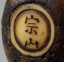 Finely carved from a section of the outer tusk, the immortal (most likely Chokaro sennin) hunched over as he embraces his magical double-gourd (hyotan). The immortal is dressed in a voluminous robe with billowing sleeves which fall and drape over his frame elegantly. Perfectly functional and generously excavated himotoshi to the back. The ivory with patches of naturally grown honey-gold patina.
