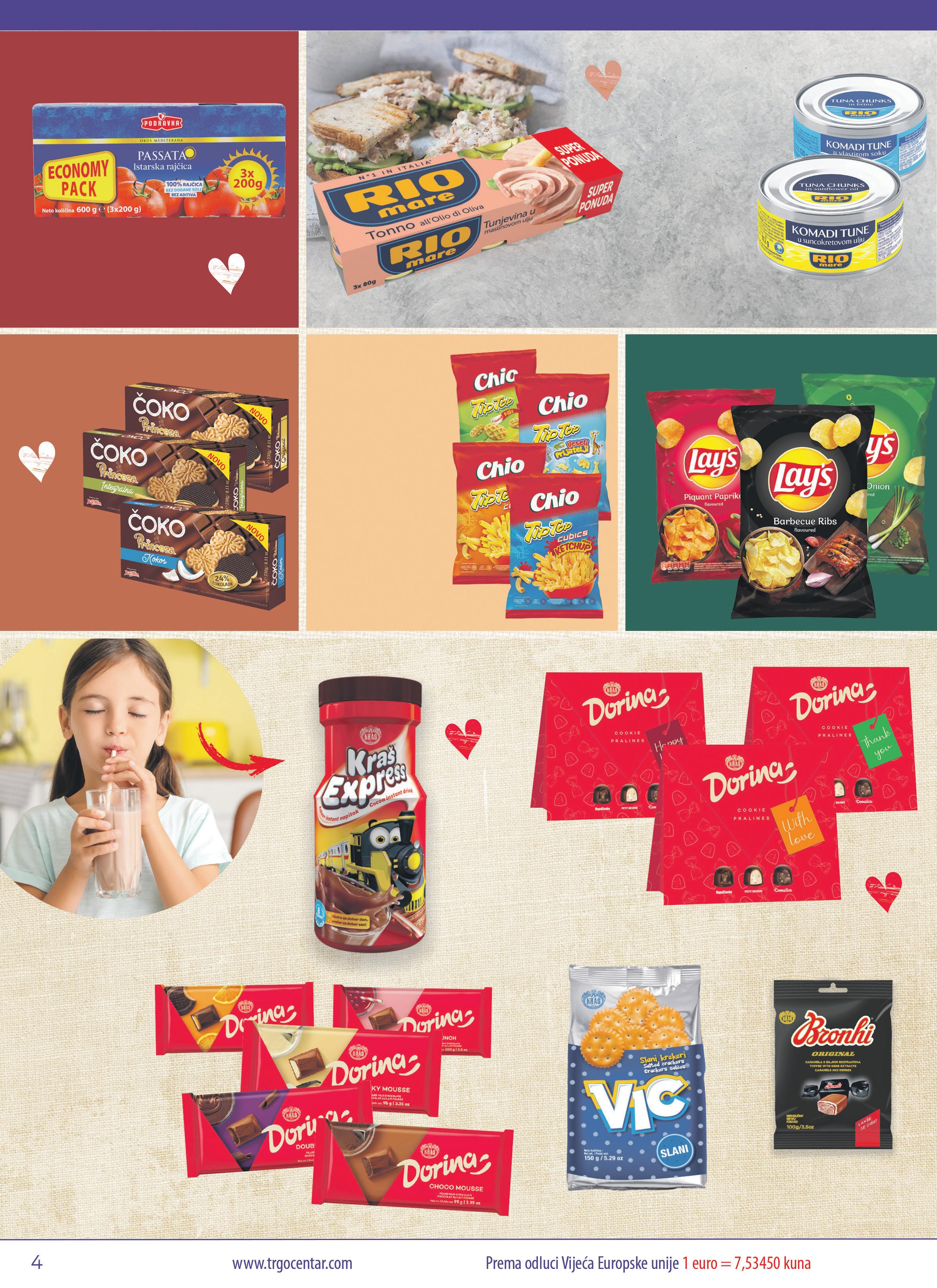 999 kn 1.33 EUR -28% 1.86 EUR*/ 13.99 kn* Pasirana rajčica Podravka, 3 x 200 g Keks Princeza čoko (više vrsta) Koestlin, 230 g 1099 kn 1.46 EUR -26% 1.99 EUR*/ 14.99 kn* 599 kn 0.80 EUR -25% 1.06 EUR*/ 7.99 kn* 599 kn 0.80 EUR -29% 1.13 EUR*/ 8.49 kn* 599 kn 0.80 EUR -25% 1.06 EUR*/ 7.99 kn* Čokolada (više vrsta) ChocoDorina,Mousse ili Milky mousse, 95 g Kokos, 98 g Double Choco, Jaffa, Ledena ili Punch, 100 g Bomboni Original Bronhi, 100 g Krekeri slani Vic, 150 g Express kakao instant Kraš, 330 g Dorina pralina Kraš, 143 g 1499 kn 1.99 EUR -31% 2.92 EUR*/ 21.99 kn* 1699 kn 2.25 EUR -29% 3.18 EUR*/ 23.99 kn* 499 kn 0.66 EUR -16% 0.80 EUR*/ 5.99 kn* Tip Top prijateljiVeseliiliPizza Chio, 45 g Tip Top Cubics ili Cubics Ketchup Chio, 50 g Tuna u maslinovom ulju Rio Mare, 3 x 80 g Komadi uljusuncokretovomNaturaletuneiliu Rio Mare, 160 g 2999 kn 3.98 EUR -37% 6.37 EUR*/ 47.99 kn* 1399 kn 1.86 EUR -44% 3.32 EUR*/ 24.99 kn* 999 kn 1.33 EUR -9% 1.46 EUR*/ 10.99 kn* Čips (više vrsta) Lay’s, 140 g