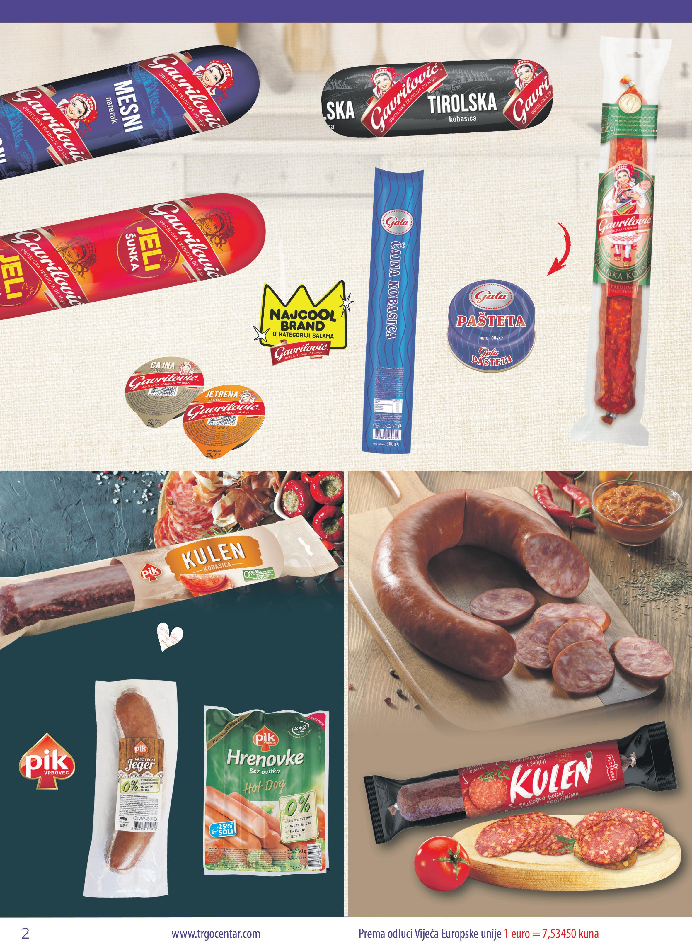 za svačijiuKus!Posjetite naše mesnice u Supercentrima: P80 Zabok, P100 Sveti križ Začretje, P49 Desinić, P60 zaprešić, P660 Bedekovčina, P195 Zlatar, P10 Veliko Trgovišće, P92 Klanjec, P72 Kumrovec, P-120 Sveti Ivan Zelina i P170 Pregrada. U Trgocentrovim MESNICAMA potražite: • kvalitetno svježe domaće meso lokalnih proizvođača i provjerenih hrvatskih dobavljača. Sve za najbolji roštilj! Sirni namaz Classic ili Čardaš Zdenka, 140 g 1349 kn 1.79 EUR -10% 1.99 EUR*/ 14.99 kn* 499 kn 0.66 EUR -23% 0.86 EUR*/ 6.49 kn* Kiselo vrhnje 12% m.m. ‘z bregov, 200 g Pileća hrenovka XXL Cekin, 1200 g Delko s paprikom Cekin, 500 g Sendvič narezak sa sirom Poliko Cekin, 500 g 2299 kn 3.05 EUR -47% 5.84 EUR*/ 43.99 kn* 1499 kn 1.99 EUR -25% 2.65 EUR*/ 19.99 kn* 1699 kn 2.25 EUR -22% 2.92 EUR*/ 21.99 kn* Gazirano piće Tangerine Vindi, 1,5 l Gazirano piće Bitter Lemon, Tonic water ili Limun limeta Vindi 1,5 l 999 kn 1.33 EUR -23% 1.72 EUR*/ 12.99 kn* 999 kn 1.33 EUR -16% 1.59 EUR*/ 11.99 kn* 849 kn 1.13 EUR -15% 1.33 EUR*/ 9.99 kn* Puding vanilija ili čokolada sa šlagom Fino mi je, 4 x 125 g Juice naranča ili jabuka Vindi, 1 l 1099 kn 1.46 EUR 1.52 EUR*/ 11.49 kn*