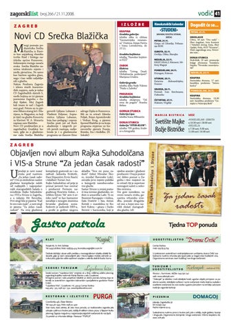 Dogodit će se... PETAK, 21.11. OROSLAVJE Crkva, 18 sati: “Oro nada” Zbor Angelusi, Ivica Kontent i Vokalisti svetog Jurja, Zbor Gjalski, Fiola, KUD “Ericsson”, Muži zagorskoga srca, Petrovske rože... DONJA STUBICA Stub-klub, 19 sati: promocija knjige aforizama Tomislava Supeka “Hrvatska zanovijetanja” NEDJELJA, 23.11. KRAPINA Festivalska dvorana, 17 sati: kazališna predstava “Ježeva kućica” PONEDJELJAK, 24.11. KRAPINA Festivalska dvorana, 19.30 sati: kazališna predstava “Genijalci u Večernjoj školi”