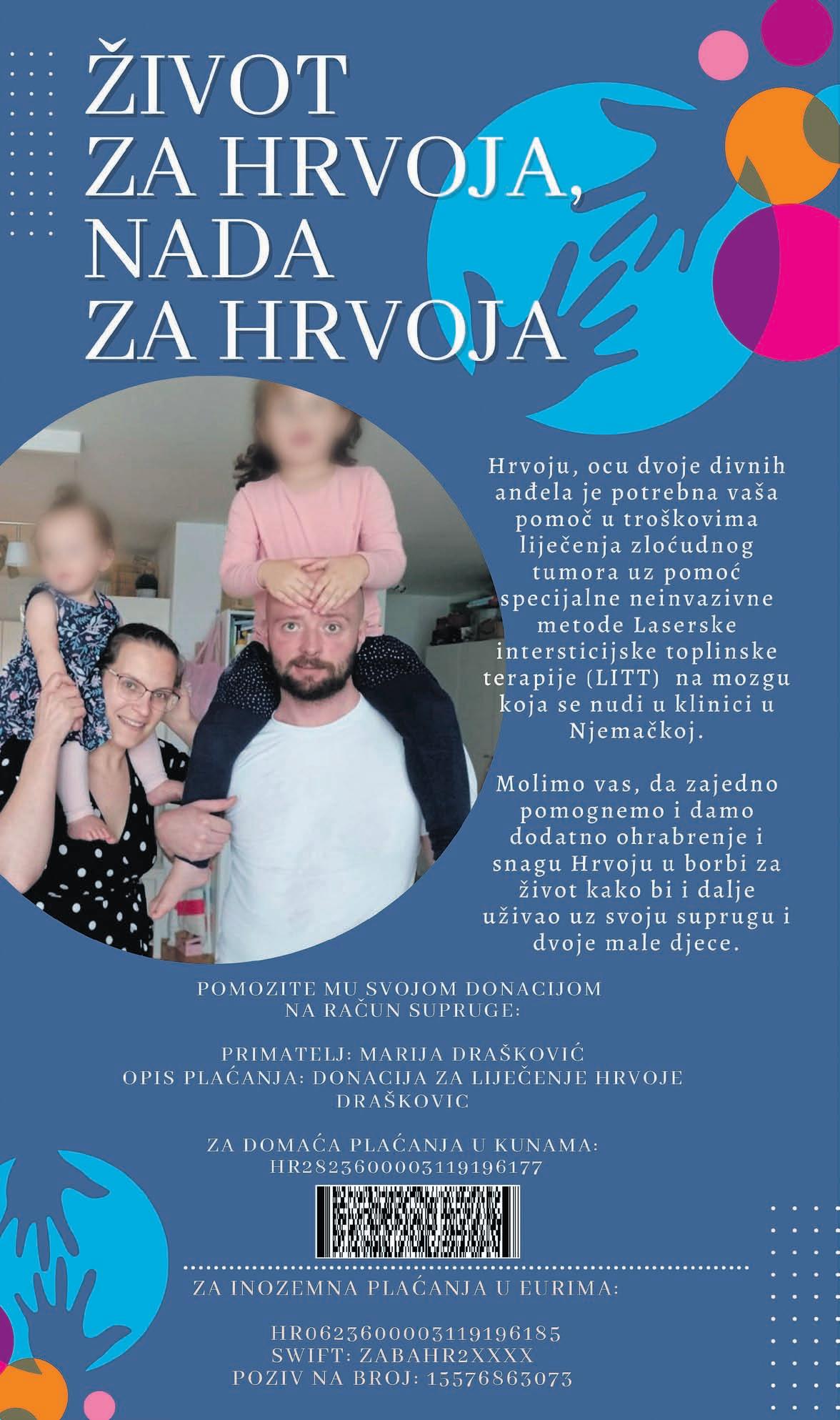 No, kako to obično biva, jedina, ali i velika prepreka je cijena zahvata u iznosu od 90.000 eura, a taj novac Hrvoje, suprug Marije i otac dvi ju kćeri (2 i 4 godine) nema. Hrvo je je, inače, po zanimanju magistar strojarstva, a nakon drhtanja i sla bosti u lijevoj ruci, u siječnju 2018. dijagnosticiran mu je četvrti stadij tumora mozga - glioblastoma mul tiforme (GBM). U četiri godine bio je podvrgnut invazivnoj operaciji uklanjanja tumora na mozgu, vi šestrukim kemoterapijama i zra čenjima, a također je sudjelovao i u eksperimentalnim tretmanima diljem Europe. Iako je tim sudjelo vanjima, osim borbi za vlastiti ži vot, uvelike doprinjeo i daljnjem istraživanju ove agresivne, zloćud ne bolesti, to je njega i njegovu obi telj poprilično financijski, ali, na žalost, i motivacijski iscrpilo.