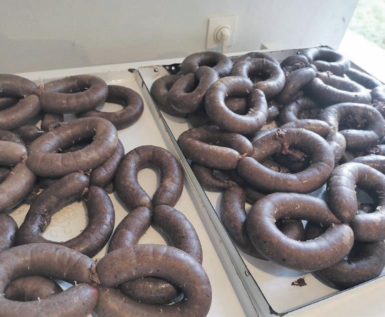 Imamo doma kolinje svake godi ne, uzgajamo svinje za svoje potre be, 4, 5 komada. Ove godine smo već imali kolinje, zaklali smo dva komada. Sve iskoristimo, napravi mo domaće krvavice, kobase, malo trajnih salami domaće izrade, s so lju, paprom, biberom i ljutom pa prikom. U ovima kaj kupite u du ćanu nutra ima svašta. Delamo i čvarke. Velika razlika je to od pro izvoda iz dućana zbog same ishra ne životinje, domaća hrana daje tom špeku drugi okus, puno finiji.